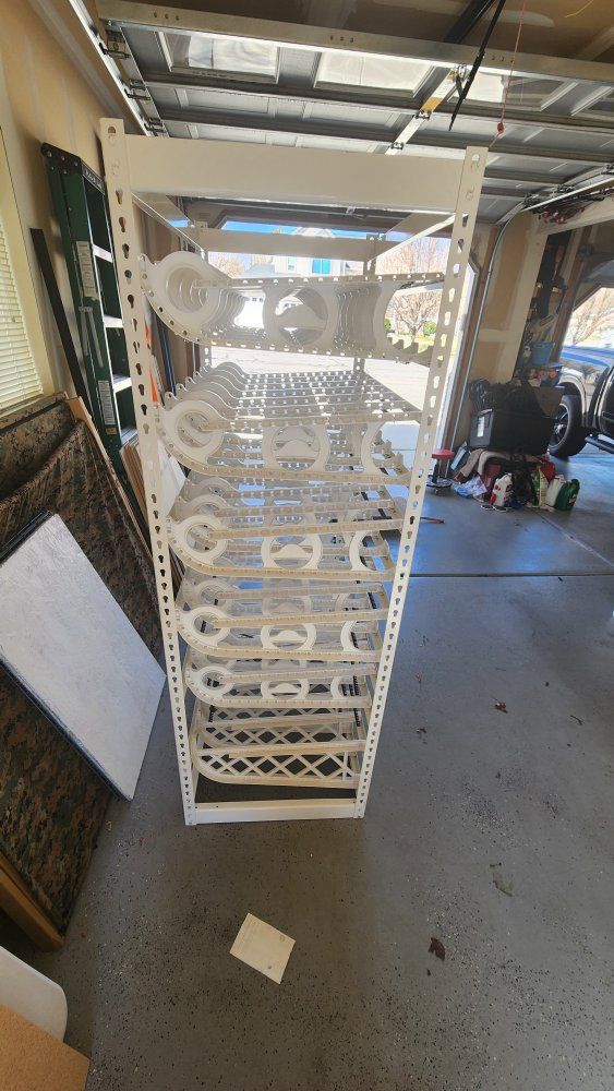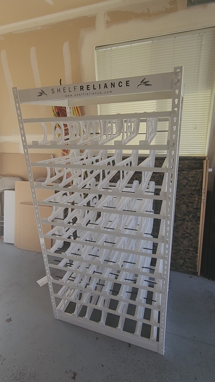 This shelf is set up different from others, has 5 small rowa of can tracks and on the very bottom has 1 row of medium for a total of 6 complete racks. all others only have 5 rows of cans storage
