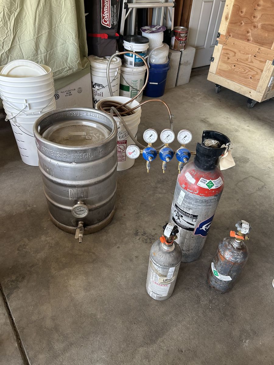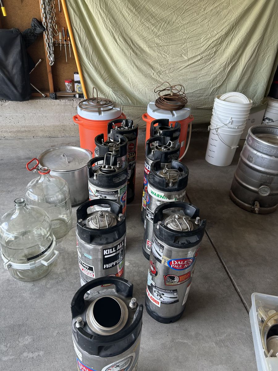 Nine 5 gallon kegs, boiling container with built in thermostat, 2 glass fermentation containers, tap equipment for beer fridge, three CO2 bottles, burner and stand, 2 containers for seeping grains, valves for 3 individual taps, regulator and a whole lot more.