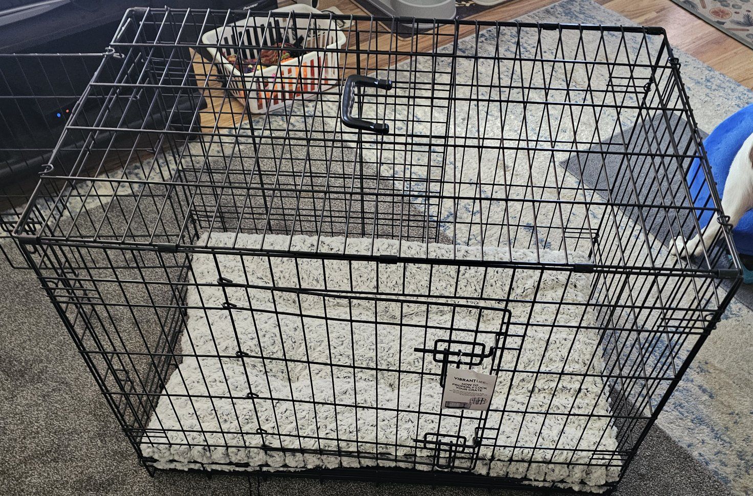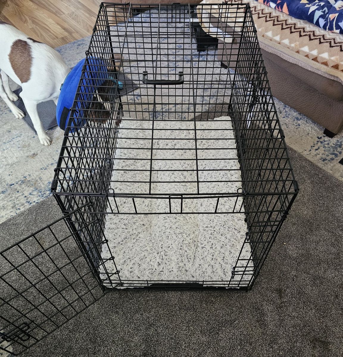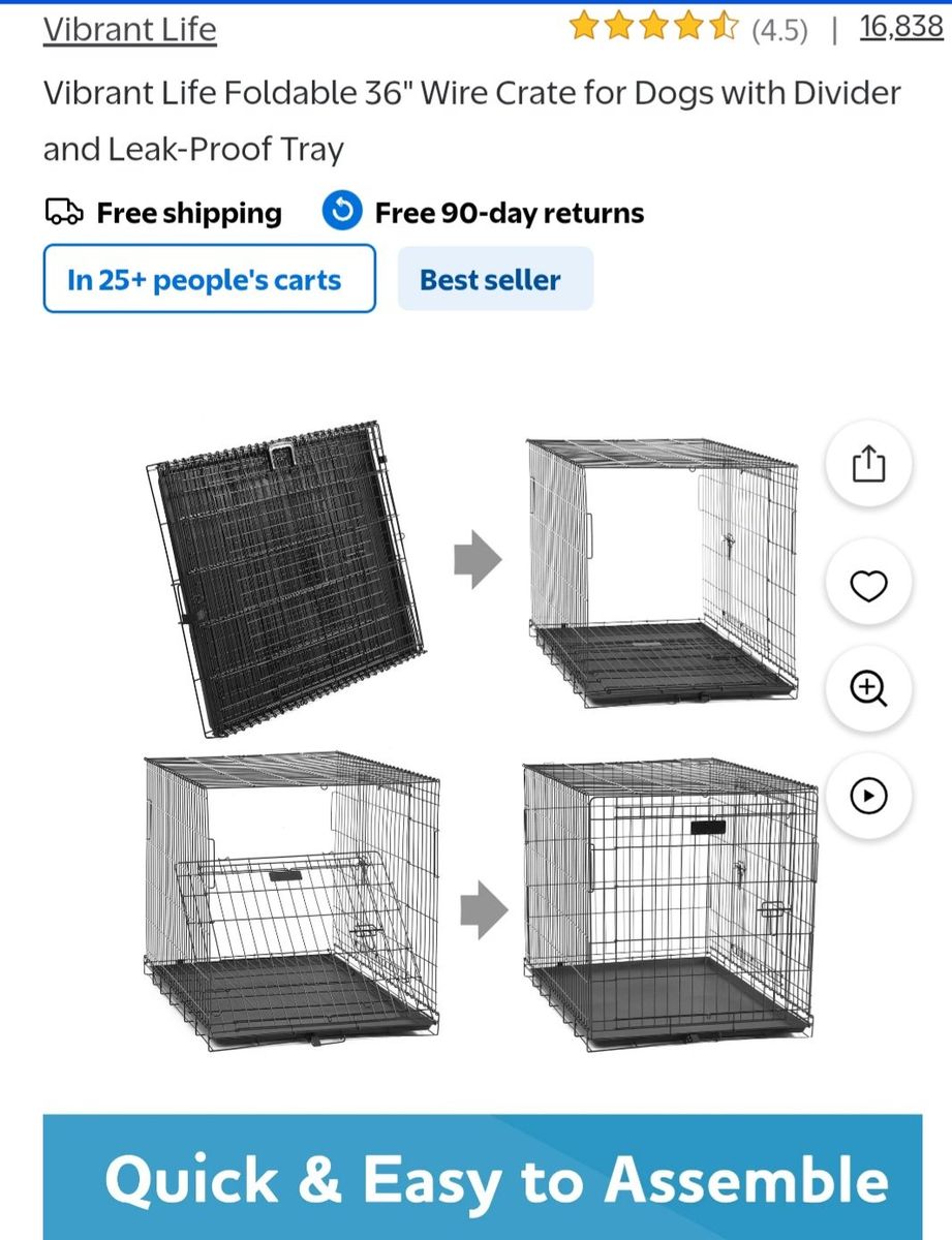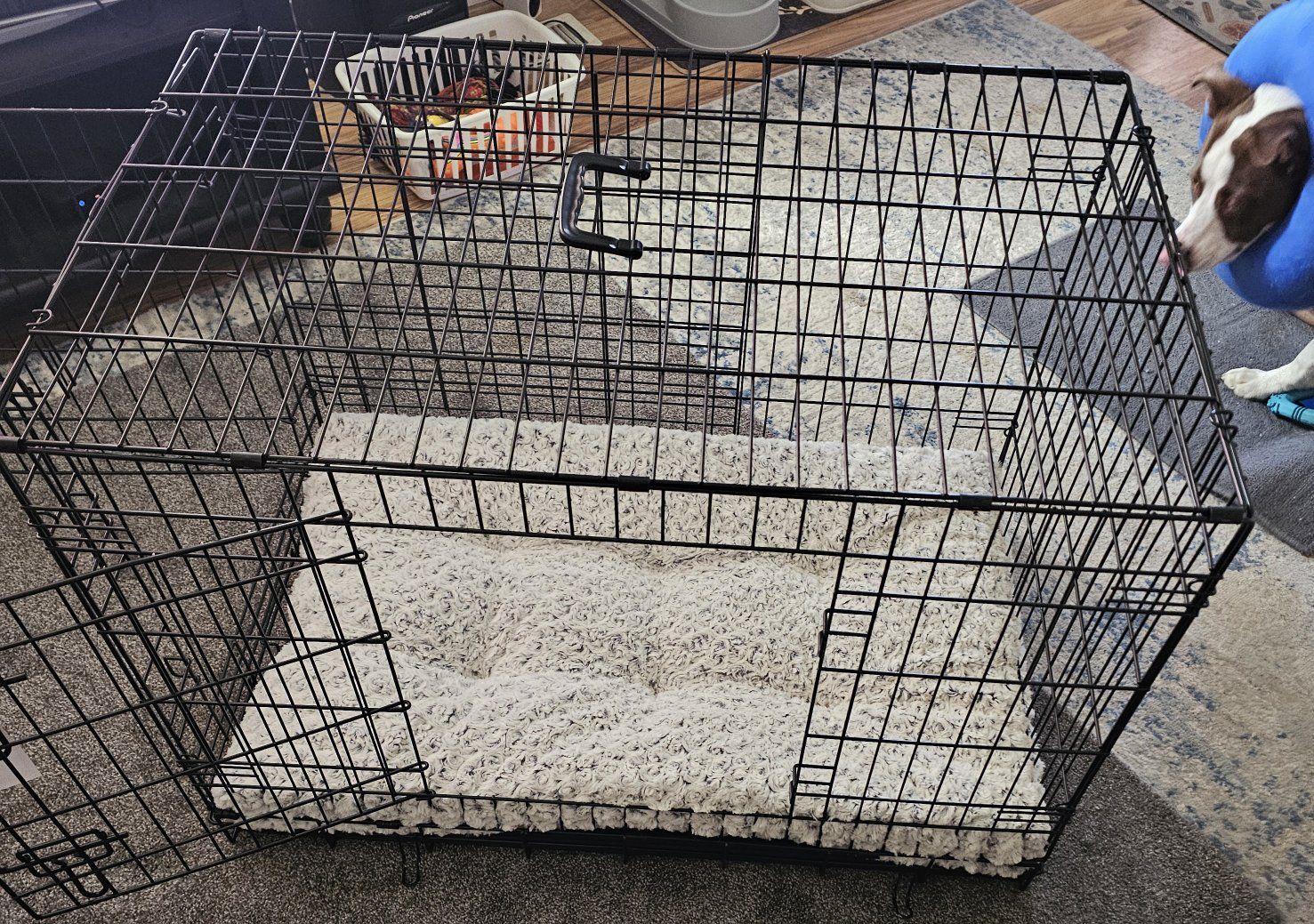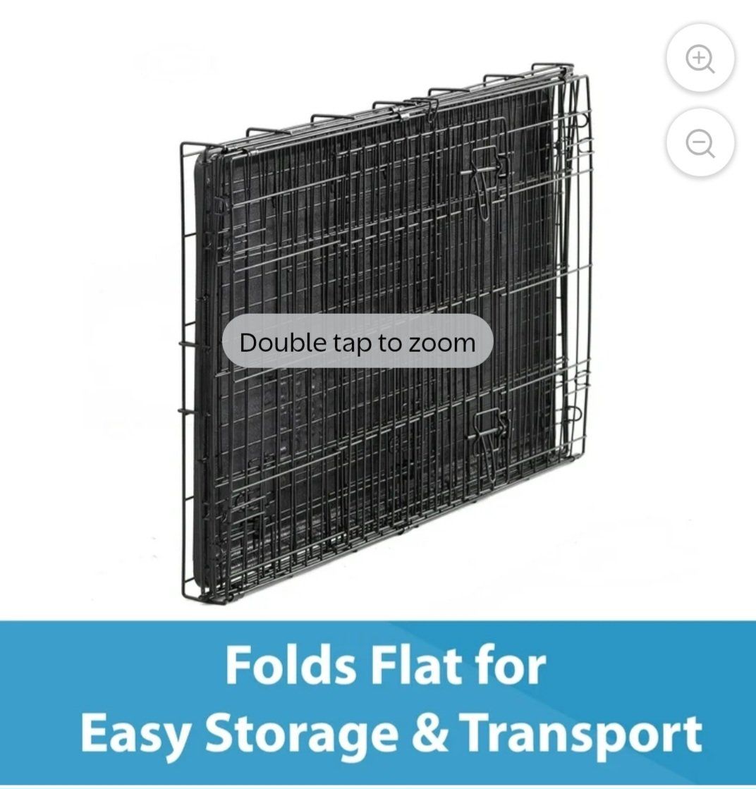 VenmoI have a foldable dog crate. It's like new. I've used it for approximately 4 months. It has 2 doors. 1 on the length end and 1 on the width end. It has a plastic, waterproof tray. The crate has a slot at the bottom to easily access the tray and slide it in and out for easy cleaning. I bought a bed for it that is also like new. It fits the crate perfectly. It also comes with a divider. $50