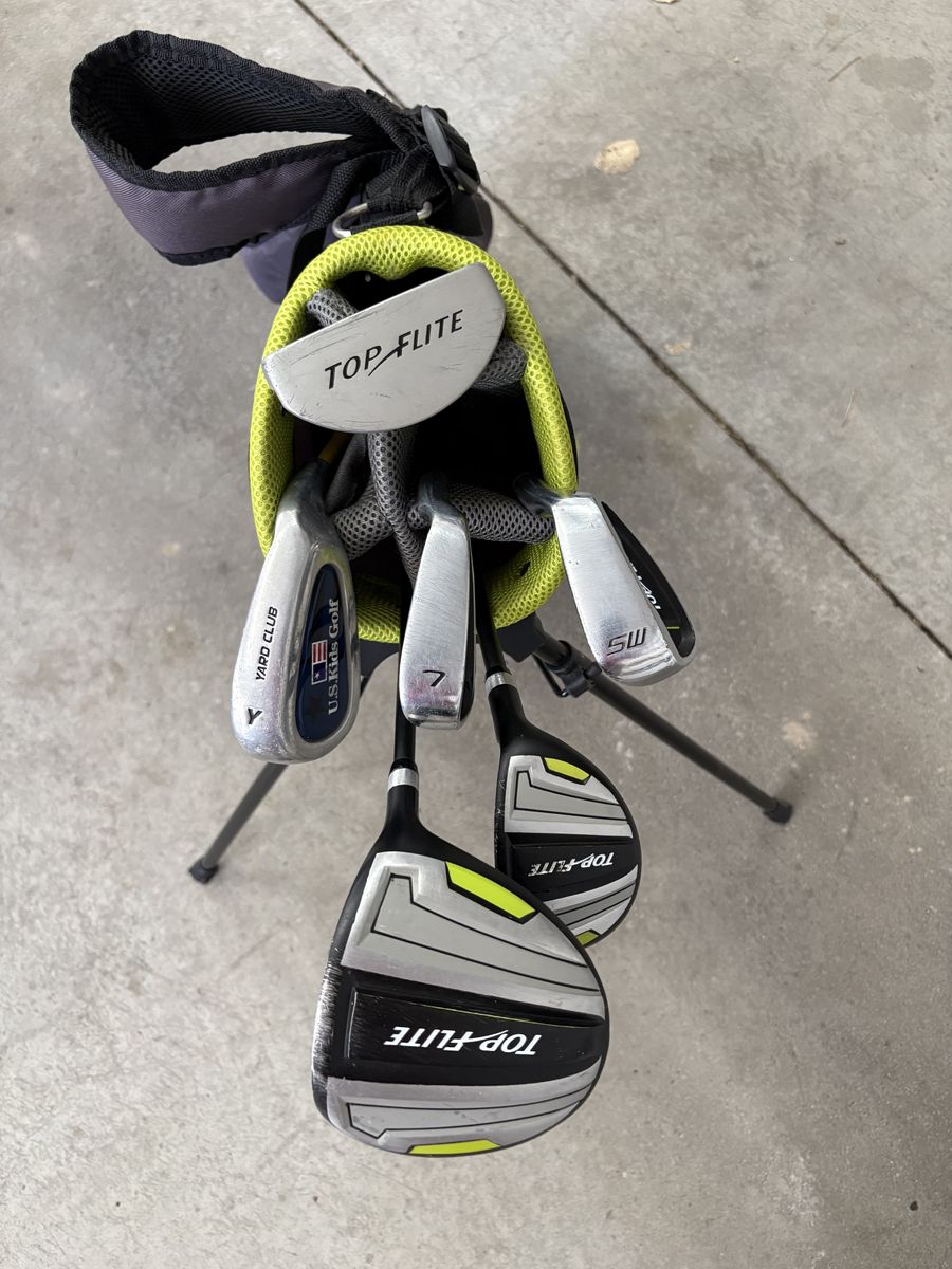 Set 1 - child set - $50 Top Flight Driver - 33inches hybrid, 7 iron, sand wedge, putter & bag (also includes “Right Start” club to help learn correct grip.)