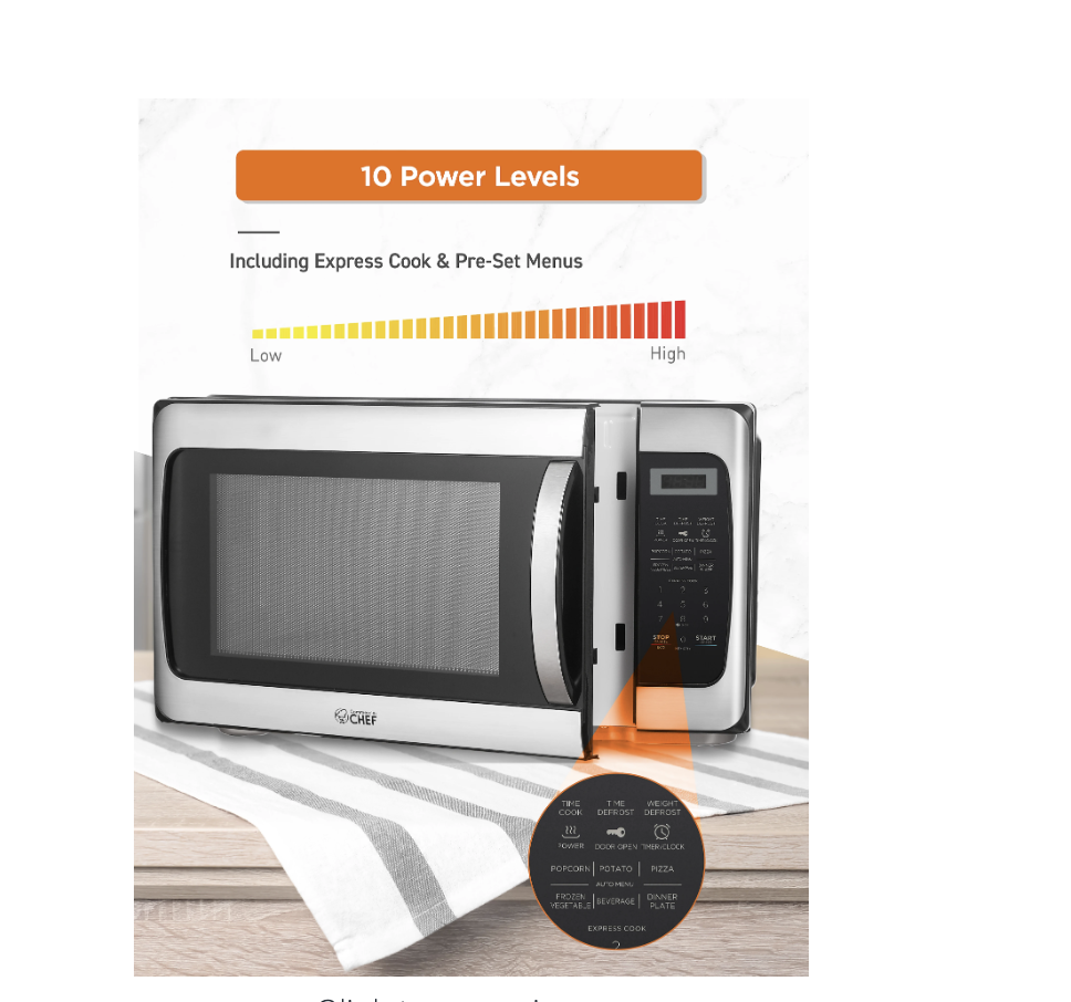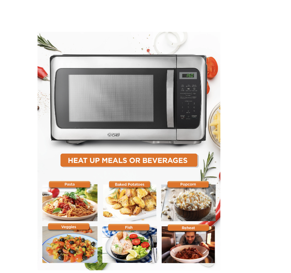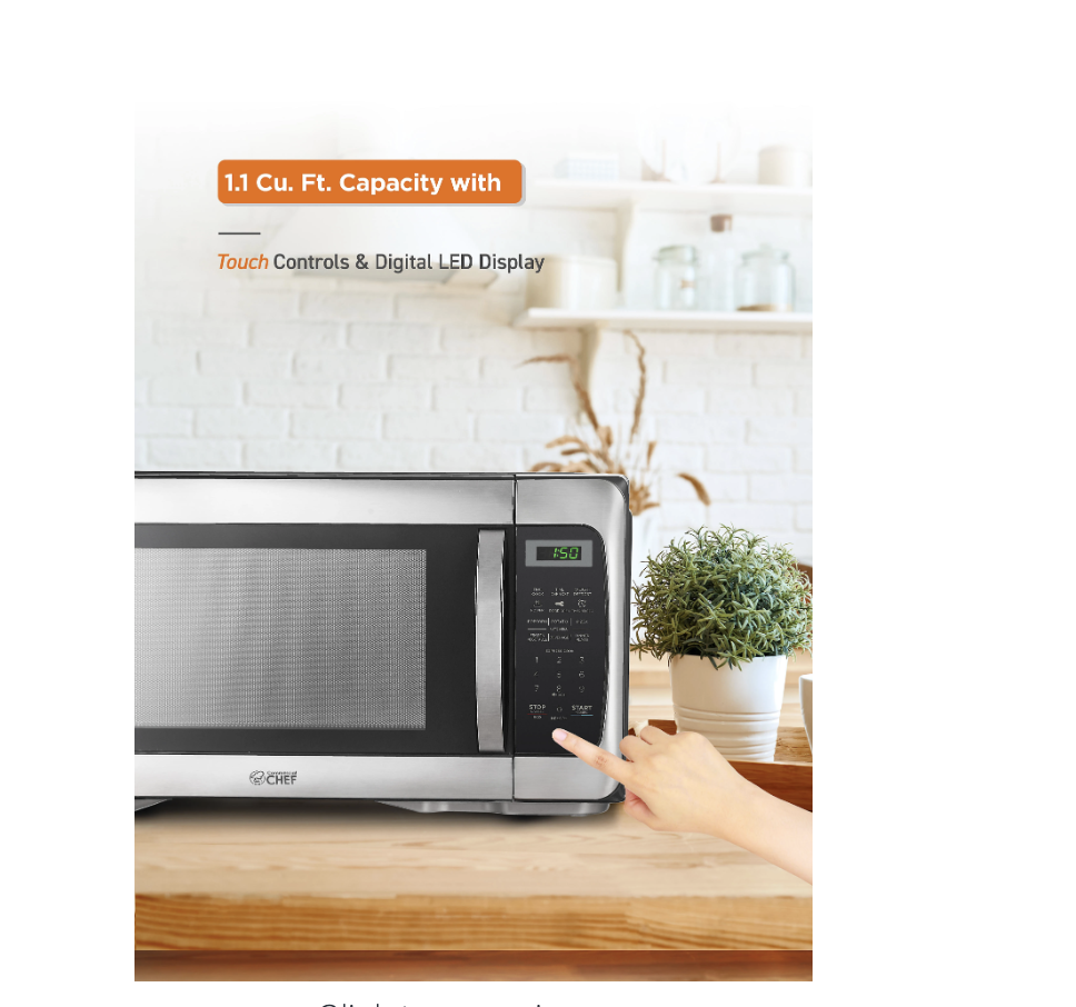 Grab a quick bite to eat with the Commercial Chef 1.1 Cu. Ft. 1000W Countertop Microwave Oven. With 6 pre-set menus to choose from, this microwave oven makes it easy to cook your favorite food, while the 10 power levels help heat food efficiently.