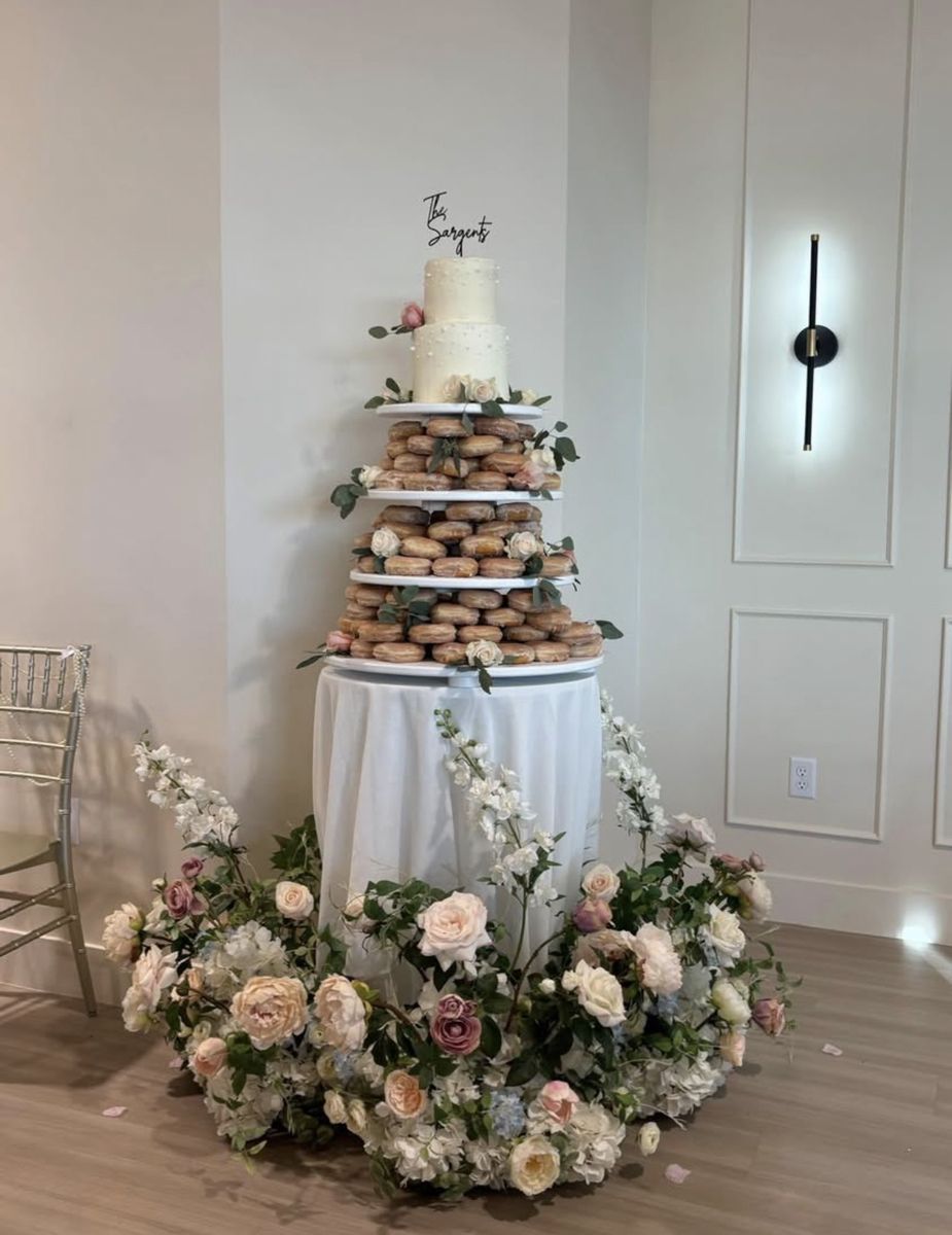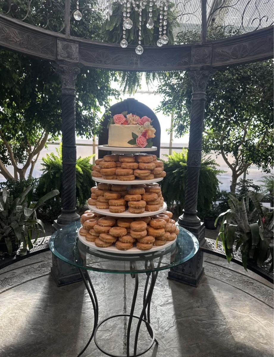 It fit around 12 dozen donuts on this stand. Perfect for receptions and adds a WOAH factor! Message me for dimensions!