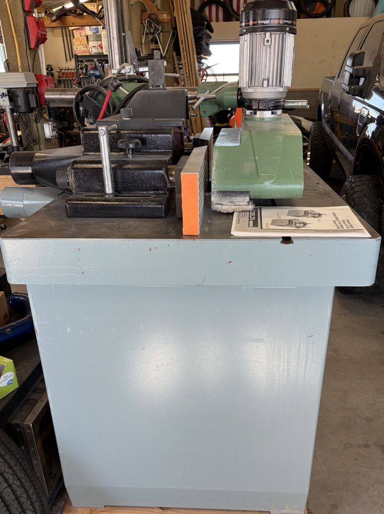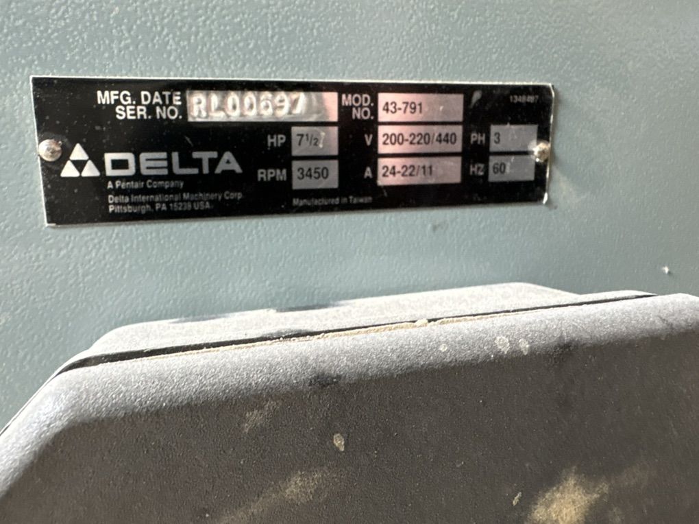 Like new, used in a one man shop Delta 43-791 is a heavy-duty 5-speed industrial wood shaper powered by a 7.5 HP, 3-phase motor (3,450 RPM) with an automatic brake. It features a large cast-iron table, a 1.25-inch interchangeable spindle, and five speeds (3000-10000 RPM). It includes a 4-roll Maggi STEFF power feeder with 8-speeds forward and reverse. Motor: 7.5 HP, 3-Phase, 230/460V. Spindle Speeds: 5 speeds (3,000 / 4,000 / 6,000 / 8,000 / 10,000 RPM). Spindle Diameter: 1-1/4 Table Size: 31-3/4 x 39-5/8”