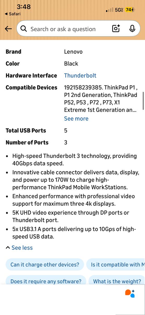 Brand Lenovo Color Black Hardware Interface Thunderbolt Compatible Devices 192158239385. ThinkPad P1 , P1 2nd Generation, ThinkPad P52, P53 , P72 , P73, X1 Extreme 1st Generation and 2nd Gneration192158239385. ThinkPad P1 , P1 2nd Generation, ThinkPad P52, P53 , P72 , P73, X1 Extreme 1st Generation an… See more Total USB Ports 5 Number of Ports 3 High-speed Thunderbolt 3 technology, providing 40Gbps data speed. Innovative cable connector delivers data, display, and power up to 170W to charge high-performance ThinkPad Mobile WorkStations. Enhanced performance with professional video support for maximum three 4k displays. 5K UHD video experience through DP ports or Thunderbolt port. 5x USB3.1 A ports delivering up to 10Gps of high-speed USB data.