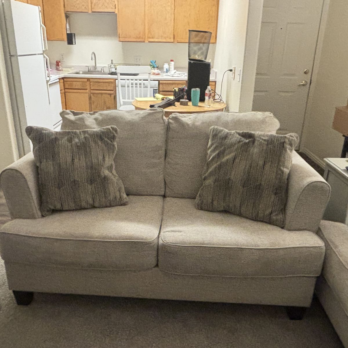 VenmoLight grey. In good condition. Could use a cleaning because it has been in storage. Cushions are still firm with throw pillows