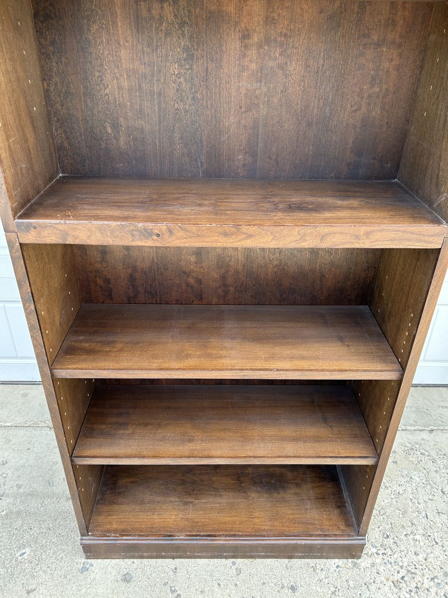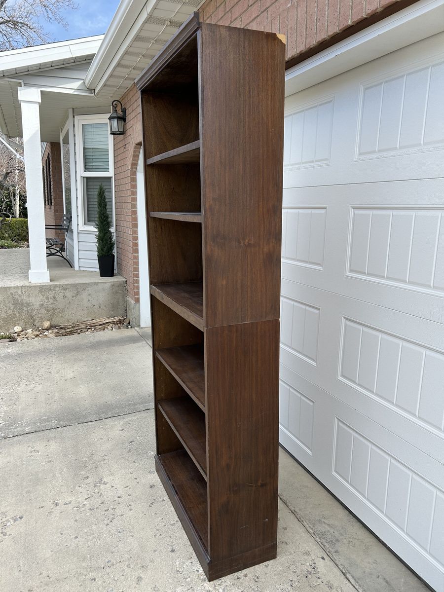 VenmoThis is a custom mahogany shelf. It was built at home so will last as long as you want it to. It has some normal wear from being 10 years old. It comes in two separate pieces to be able to move in and out of rooms easily. The shelves are adjustable. It is 12 inches deep, 7 feet high, 34 inches wide. Just looking for enough money to take my family out to dinner.