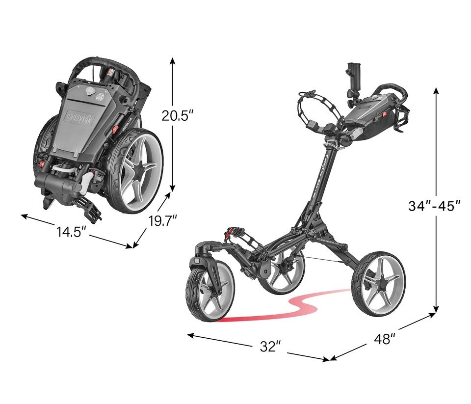 The most compact folded golf pushcart in the market by Caddytek now comes with patented Auto Folding/Unfolding mechanism and Swivel Front Wheel. The new CaddyLite AUTO +360 can be folded and unfolded in one simple step and golfer can switch between swivel or locked front wheel easily by toggle the lever on the cart handle. Although the folded CaddyLite AUTO +360 is compact, yet the entended cart comes with 32” wide body design, 3 large ball bearing wheels and the multiple handle positions make it rolls easily and effortless on all kinds of terrain and in the tall grass. The CaddyLite Auto +360 has plenty of storage and features that most golfers want, including umbrella, scorecard, and beverage holders. Rain or shine, cart your clubs around the green in style and enjoy the game!