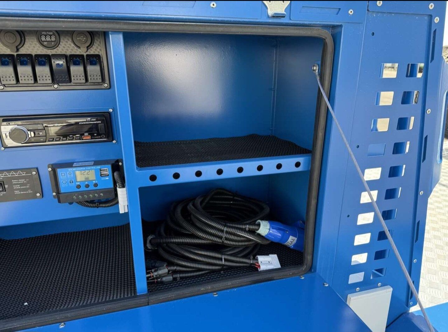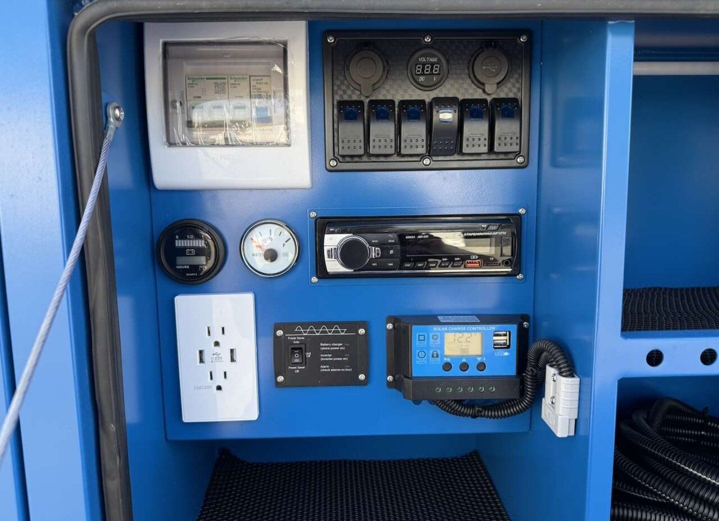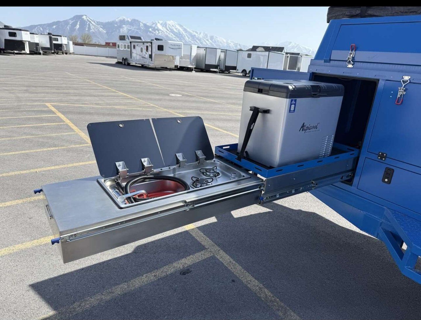 Kitchen setup with sink, gas range, and electric fridge, Large 180° awning for shade and a good hangout space, Battery system with solar panel, Fresh water storage, LED lighting, stereo, and much more.