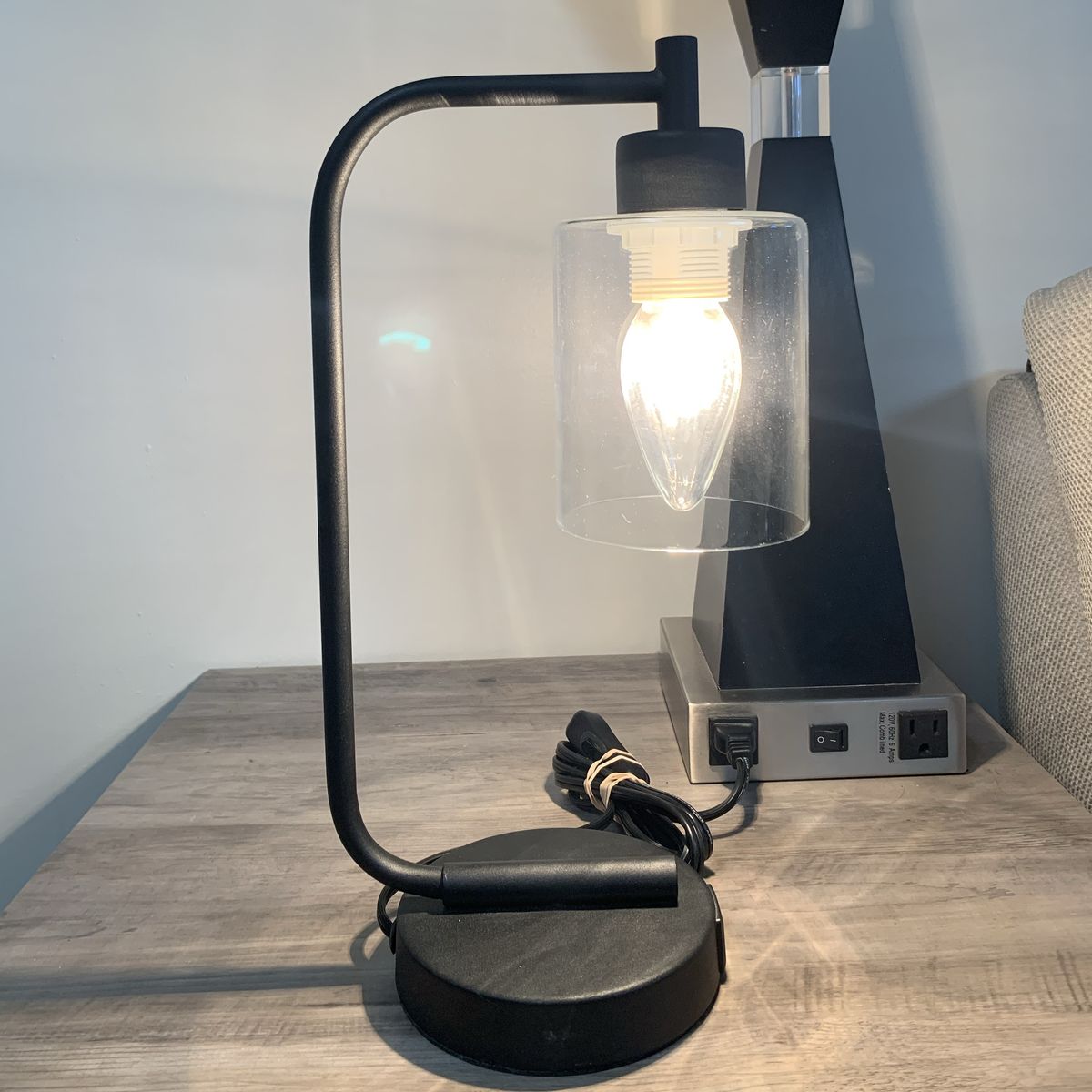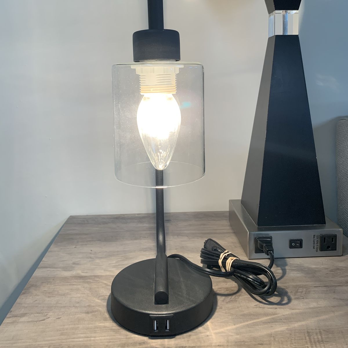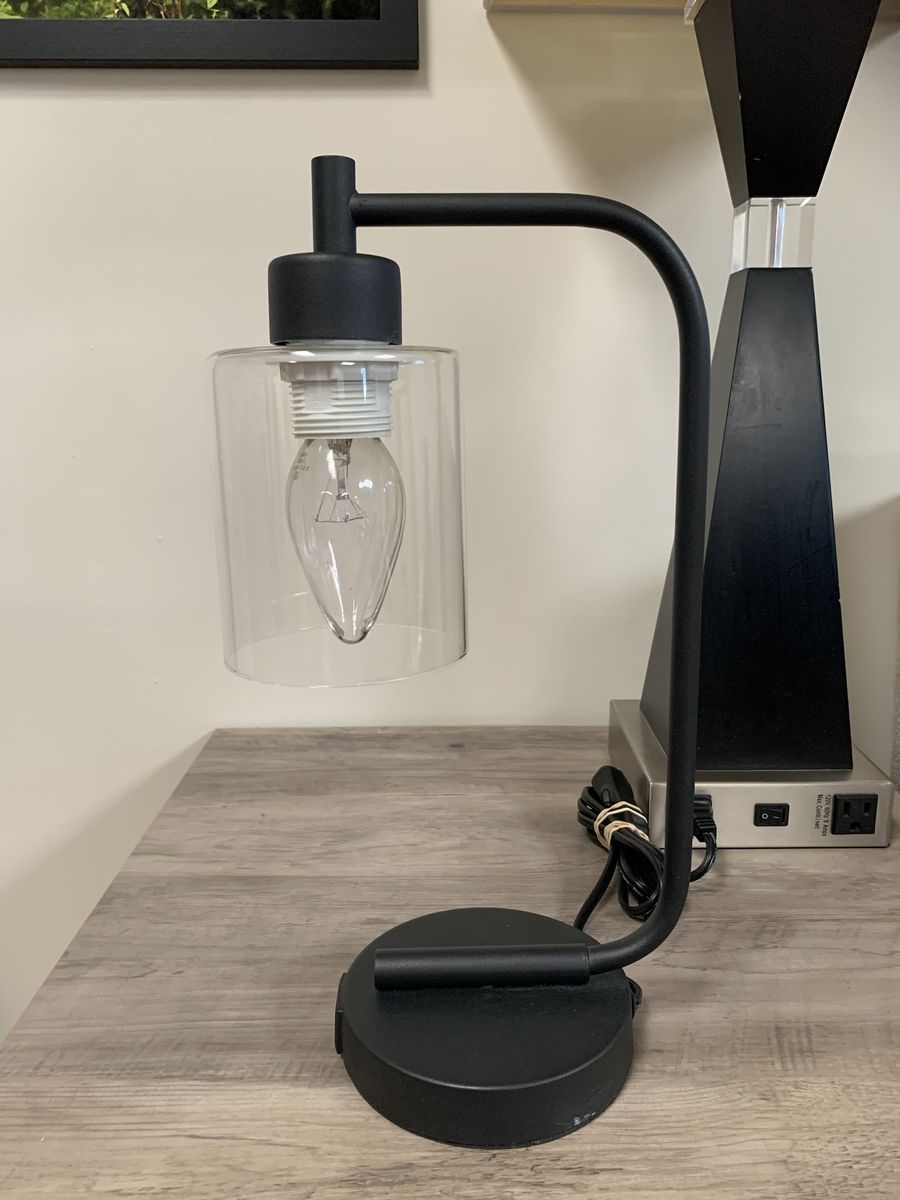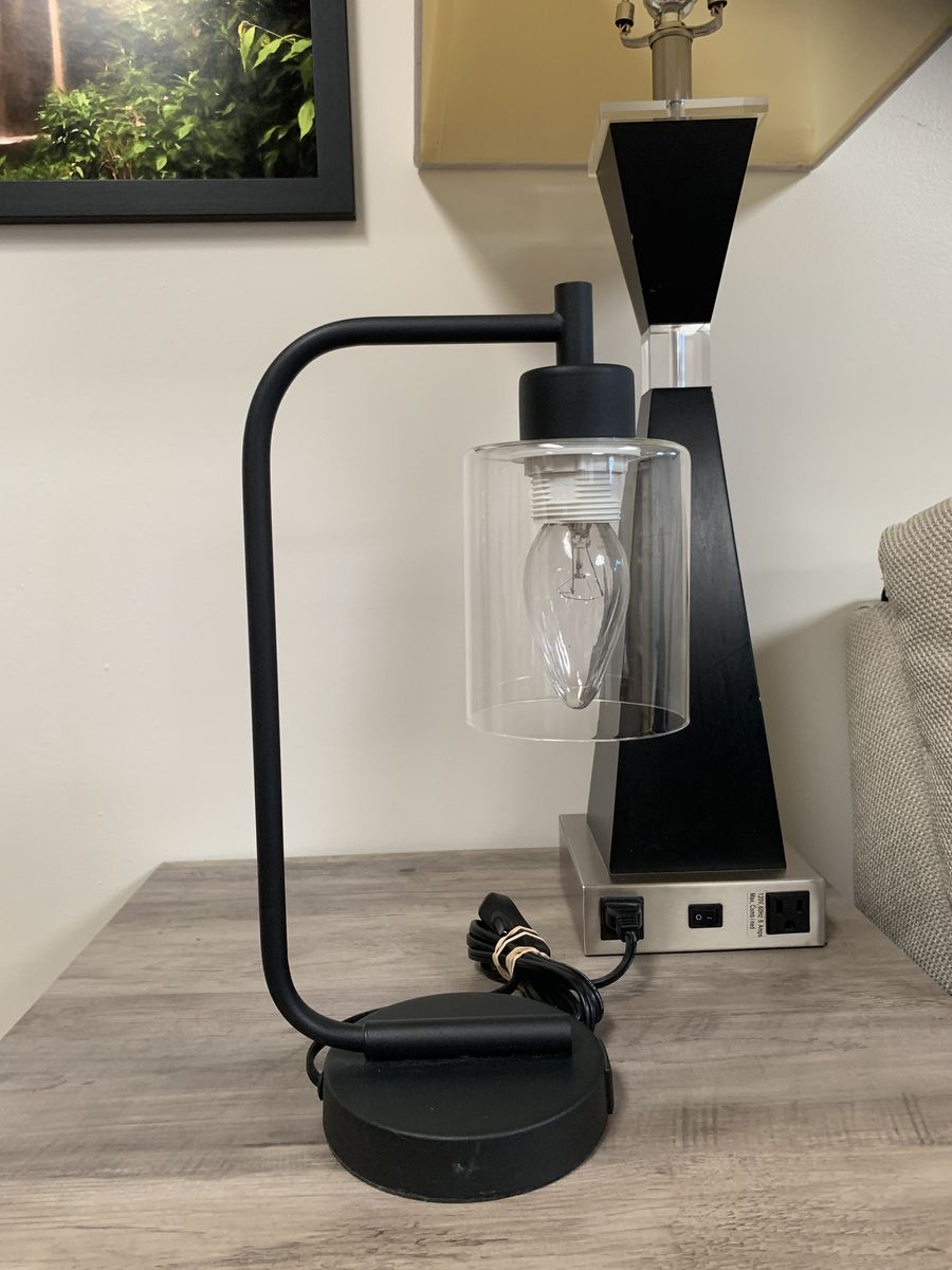 VenmoSimple yet modern. It combines a simple base with a curved arm and a clear cylinder glass shade. Has 2 working front usb ports. 15”H x 8”W. Toggle switch on cord. Clean. Venmo to hold. Non-smoking/No pet home.