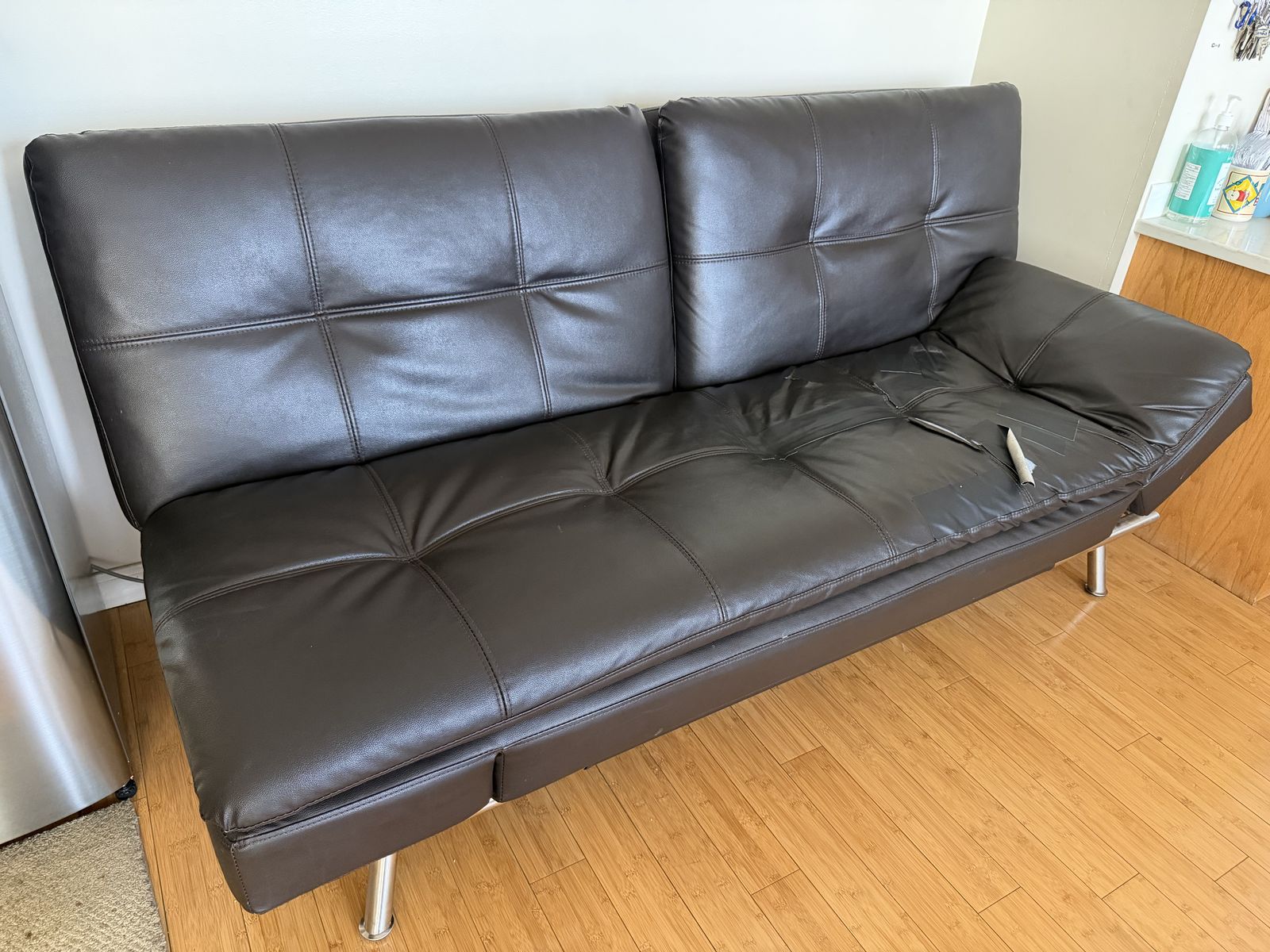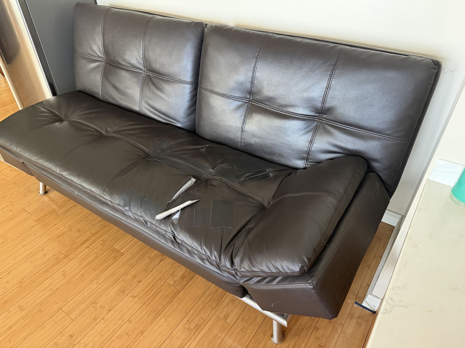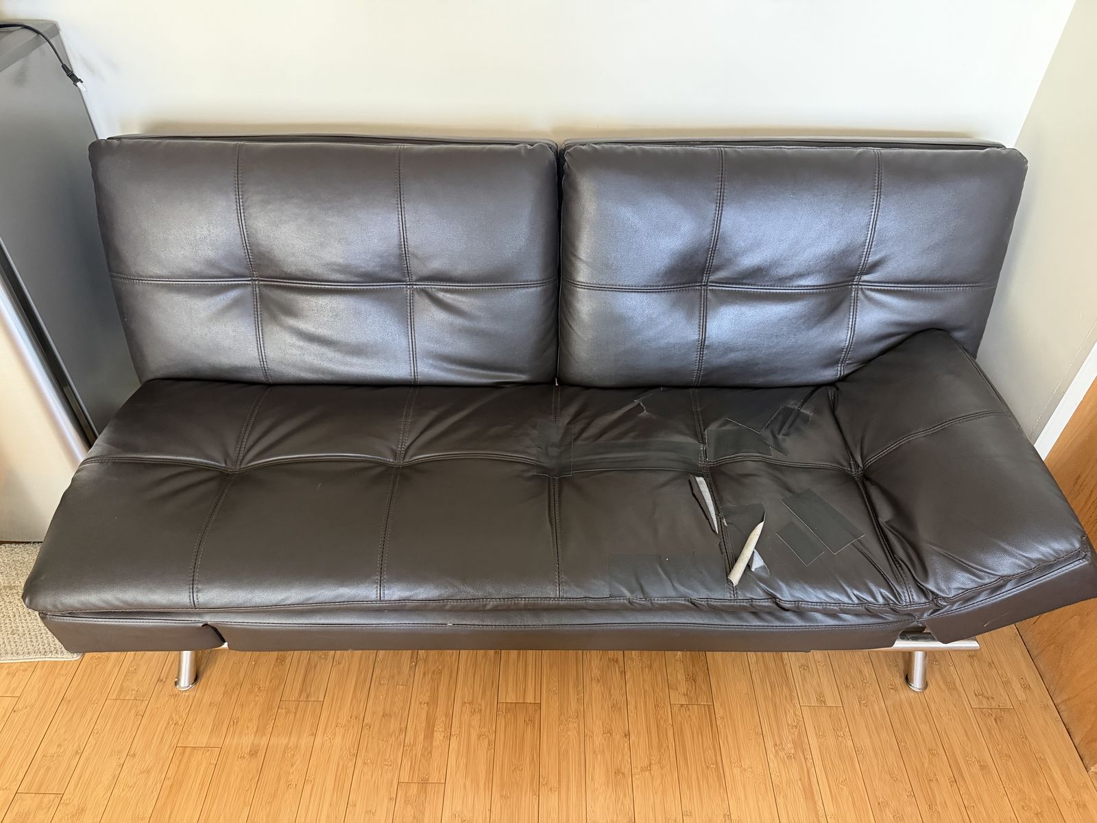 VenmoBlack faux leather futon with some torn sections on the seat.