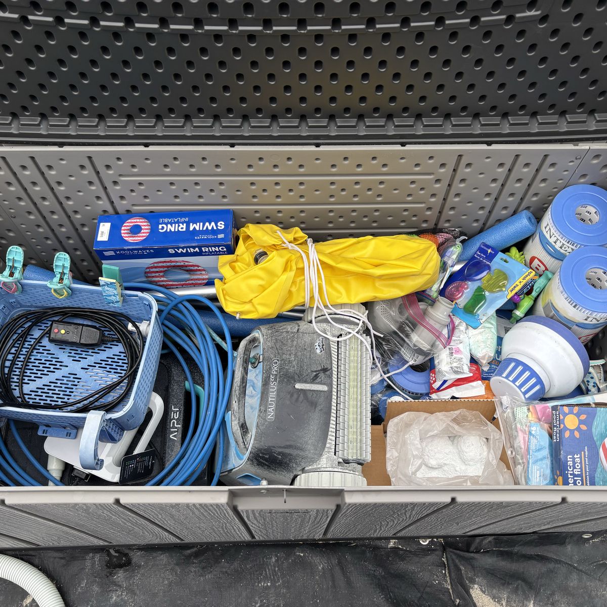 Intex 18' x 9' x 52 Ultra XTR Rectangular Frame Swimming Pool purchased in 2021. -Pool Skimmer purchased in July. -9’ x 18’ Solar Pool liner purchased in July-never used. -WiFi Pool Vacuum purchased in June. -Solar Pool Heater (has broken leg) -Pump purchased in June. -Extra supplies included: pump filters, chlorine tablets, pool floats/toys (never used), maintenance tablets, other pool chemicals, spare pump and accessories, hose water filter, pool towels. -Has wood stair case for outer entrance with slot for ladder to get in the pool. *1 strap that holds supporting poles is broken. I haven’t had any issues. *Lifetime storage box not included.