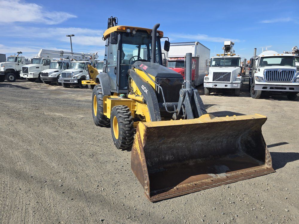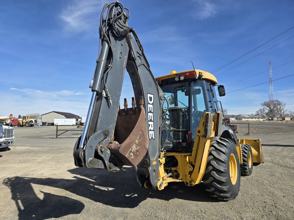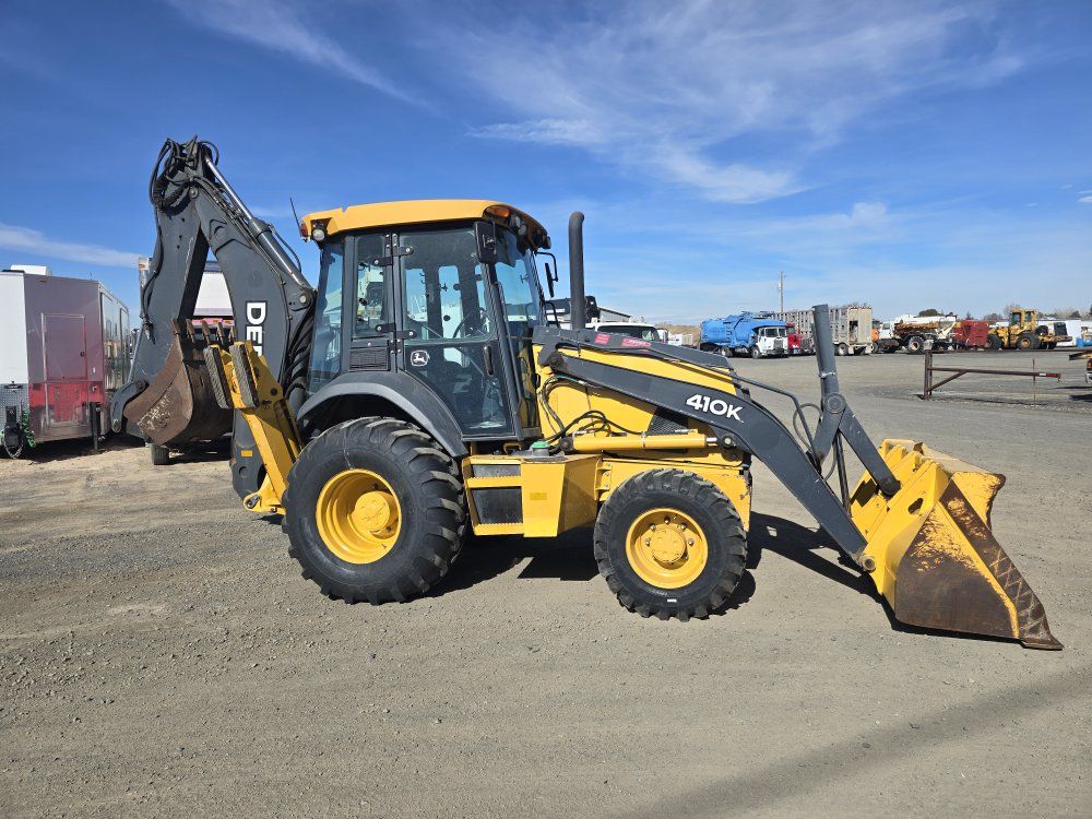 2014 John Deere 410K extendahoe backhoe, 105 horsepower John Deere diesel engine, 3,300 hours, four wheel drive, ride control, auxiliary hydraulics, Wayne Roy quick attach, 30 inch rear digging bucket, pilot controls, pattern changer, new tires, former municipal machine 208-734-3434