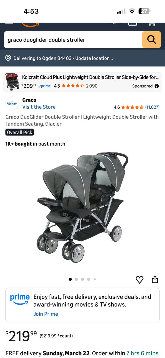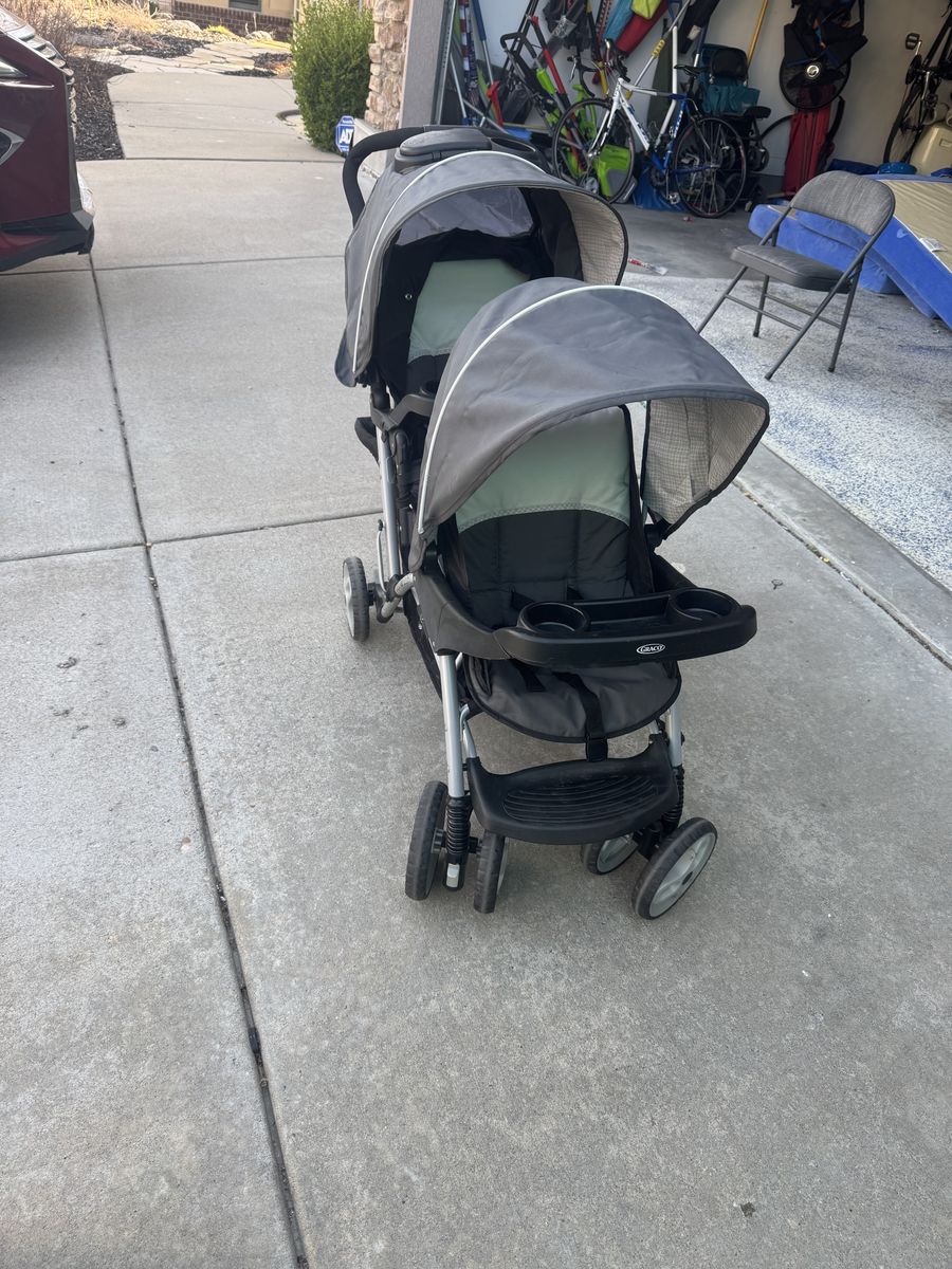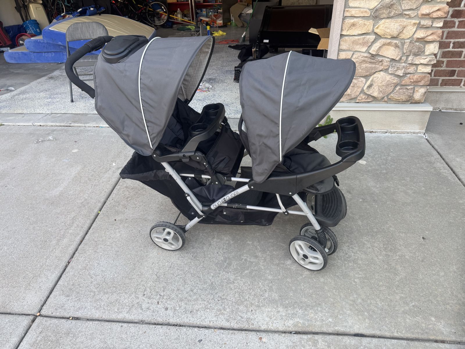 Venmooxford cloth Imported Accepts two Graco SnugRide infant car seats (stroller is not compatible with convertible, 3-in-1, or 4-in-1 car seats); Tandem stroller features 2 toddler seats; each seat holds a child up to 40 lb One hand, standing fold closes easily with no bending necessary, leaving one hand Free for baby; Easy access, drop down storage basket lets you reach in without disturbing Your reclined child Double stroller features 2 reclining seats with individual canopies and footrests; rear seat reclines Completely flat when baby's had enough adventure Lockable front swivel wheels with suspension for superior maneuverability; parents tray with storage and 2 cup deep Holders for on the go convenience Stroller weight: 29.5 pounds; Stroller length: 36 inches; Stroller width: 20.5 inches; Stroller height: 41 inches; Folded height: 29.5 inches; Folded width: 20.5 inches Extra Large storage basket provides room for all Your essentials Parent's tray with storage and 2 deep cup holders for on-the-go convenience Both seats feature child's trays with cup holders to keep snacks and drinks close by 3-point harness grows with your child Stroller holds 2 children up to 40 lb each