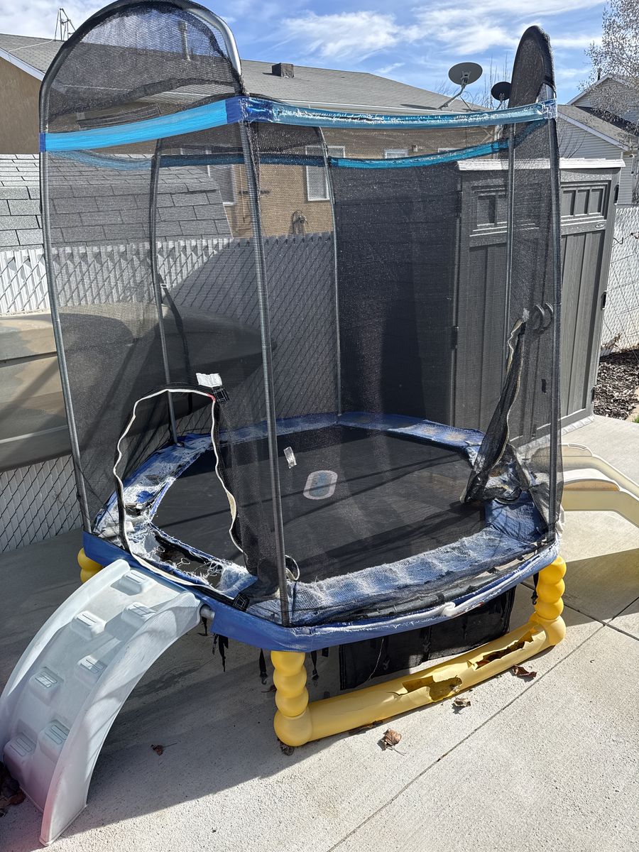 VenmoClimb and slide 7ft hexagon trampoline by little tikes. Well warn but the mat is still in good shape. $35 obo to who ever wants to haul it away.