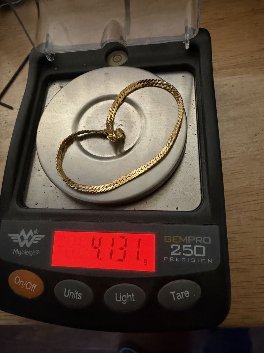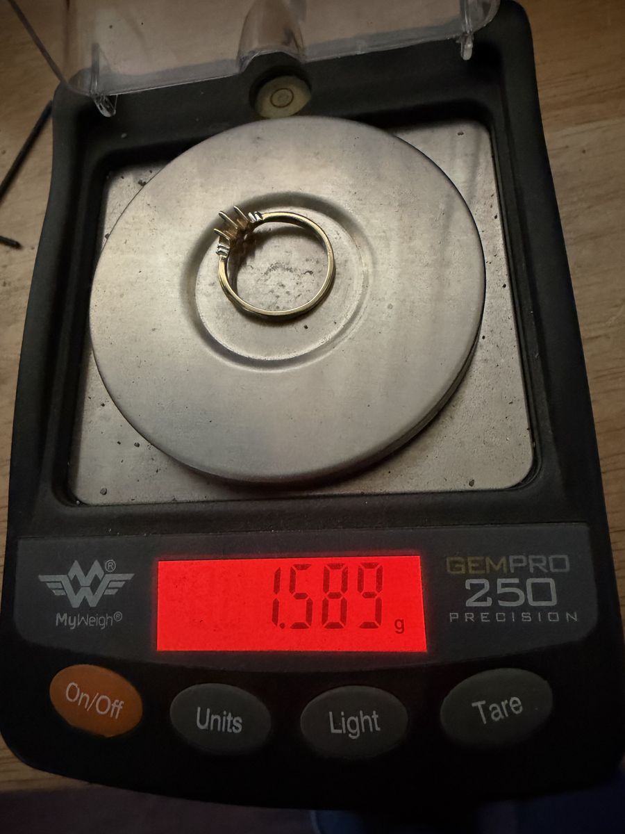 12.379 grams of 14k gold jewelry and 1.589 grams of 10k gold ring. Currently spot is $1,205, asking $1150.00