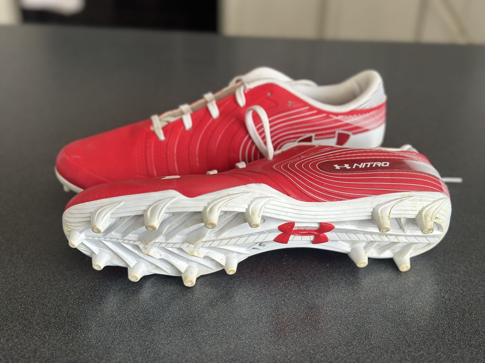 VenmoUsed Under Armour Men's Nitro Low Mc Football Shoe, size 11.5 , Red/White asking 20