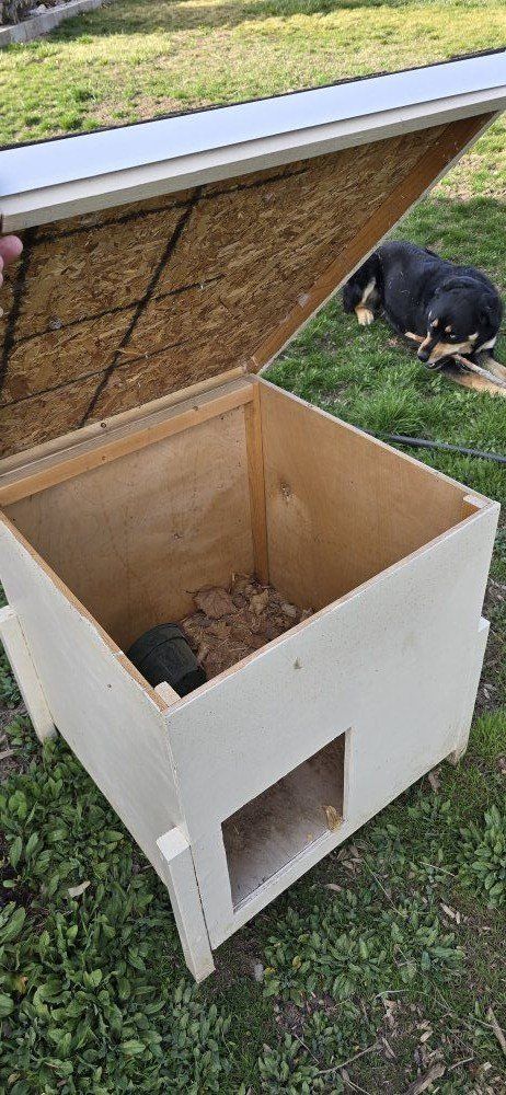 Custom made animal den/shelter. The sides and floor are built out of 1/2" plywood and the roof is OSB. It sits on legs a few inches off the ground to keep the floor dry. Has singles and flashing on it and the roof overhangs the front a little for weather protection. The roof also opens up for easy cleaning. The shelter itself is 24"x24"x24" and the roof is 27"x32". Could be good for chickens, rabbits, cats, or other small outdoor critters. Asking $80 OBO