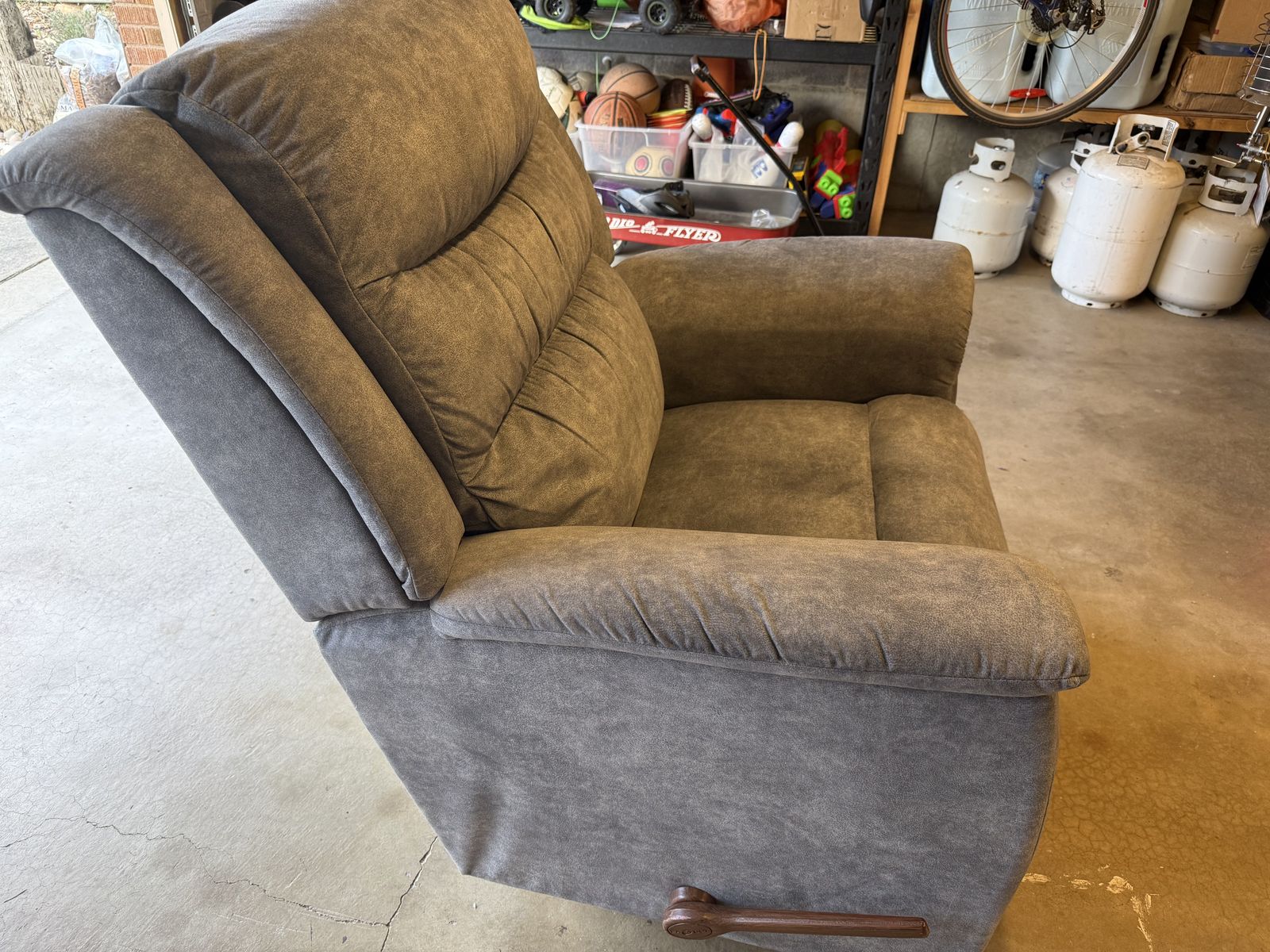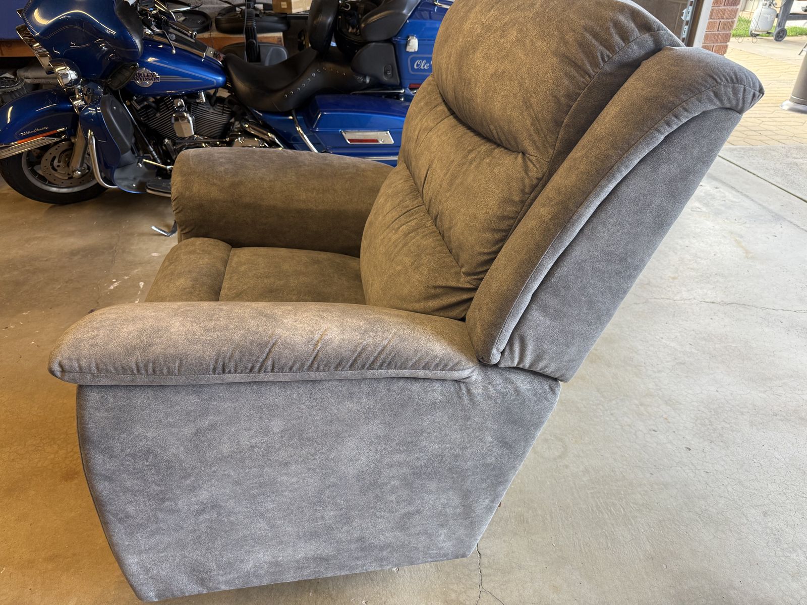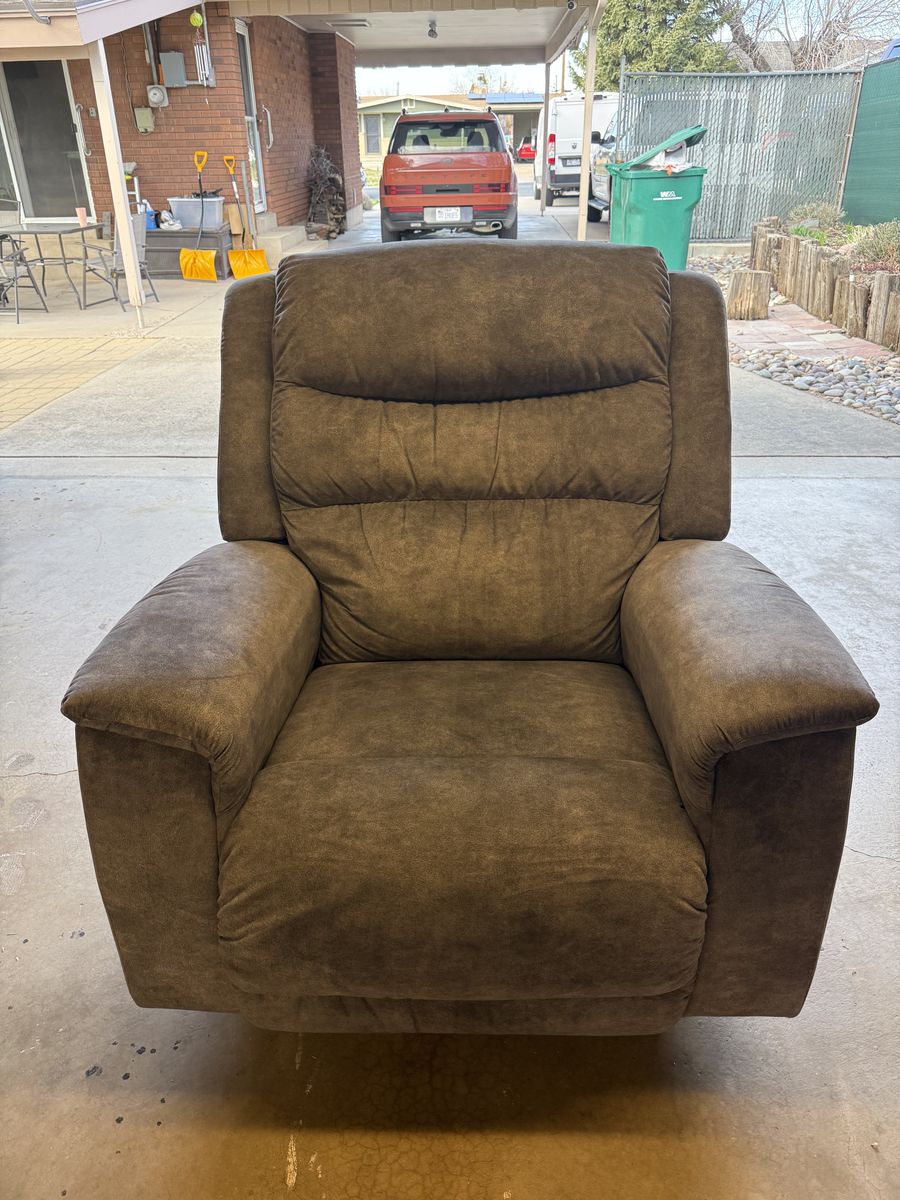 This is a fairly large rocker recliner. It is not electric. I am 6‘2“ and it is comfortable for me. My feet barely touched the floor. It is in good shape, except for the back corner has been damaged. I put a couple of tax in it just to keep it from becoming worse. You can check out the pictures to see the damage.