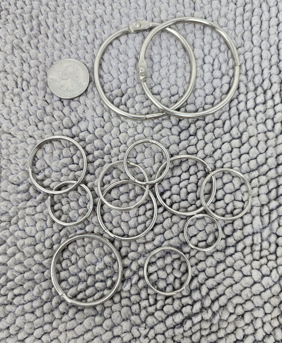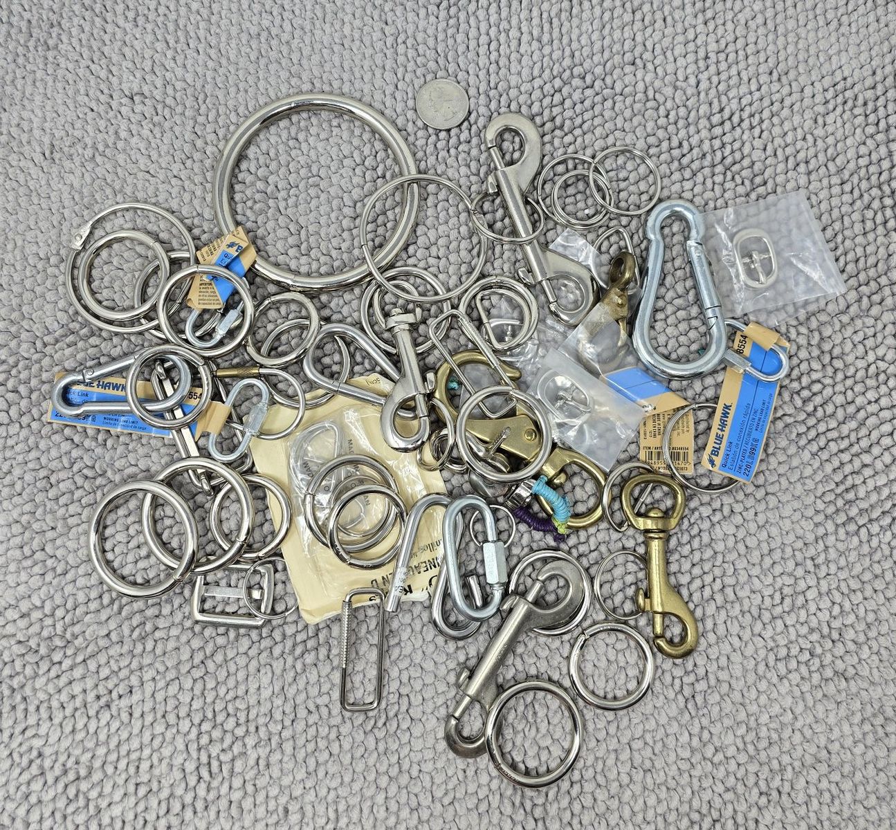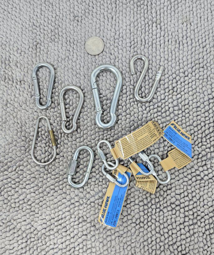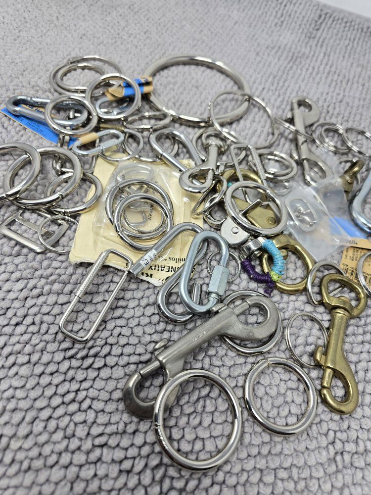 VenmoLarge mixed lot of metal hardware including clips, rings, carabiners, D-rings, and various connectors.