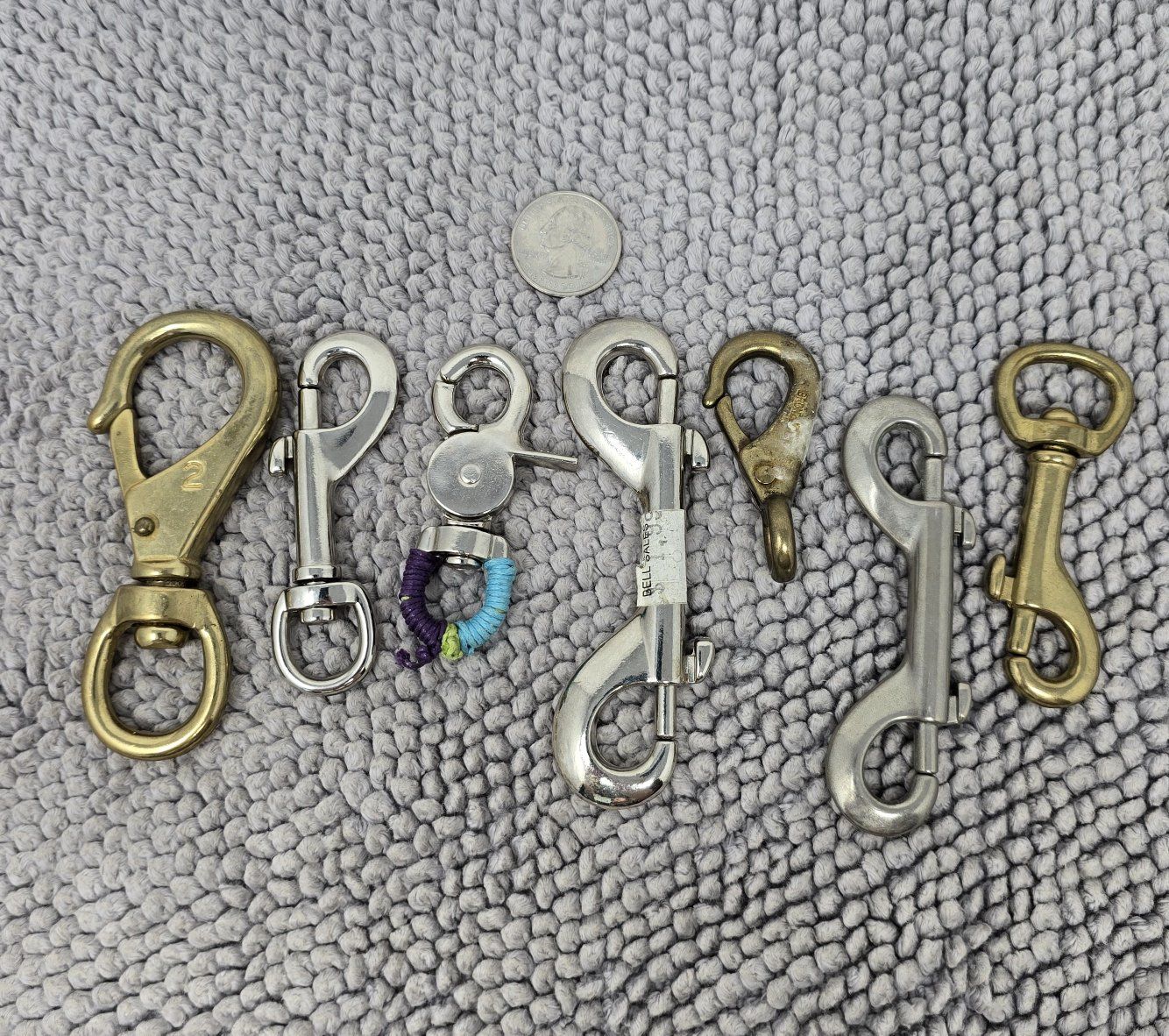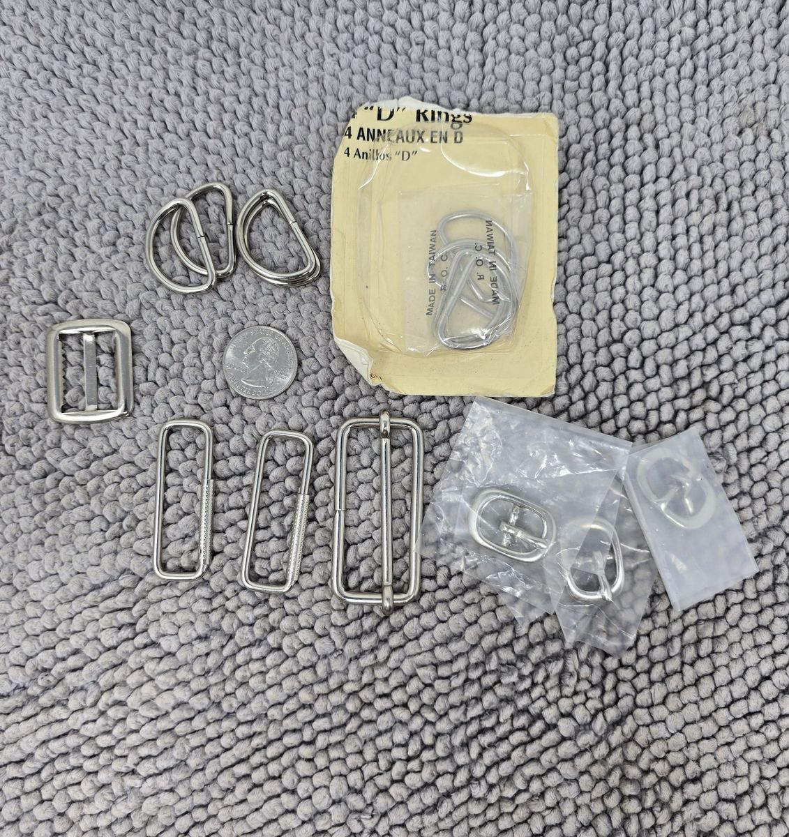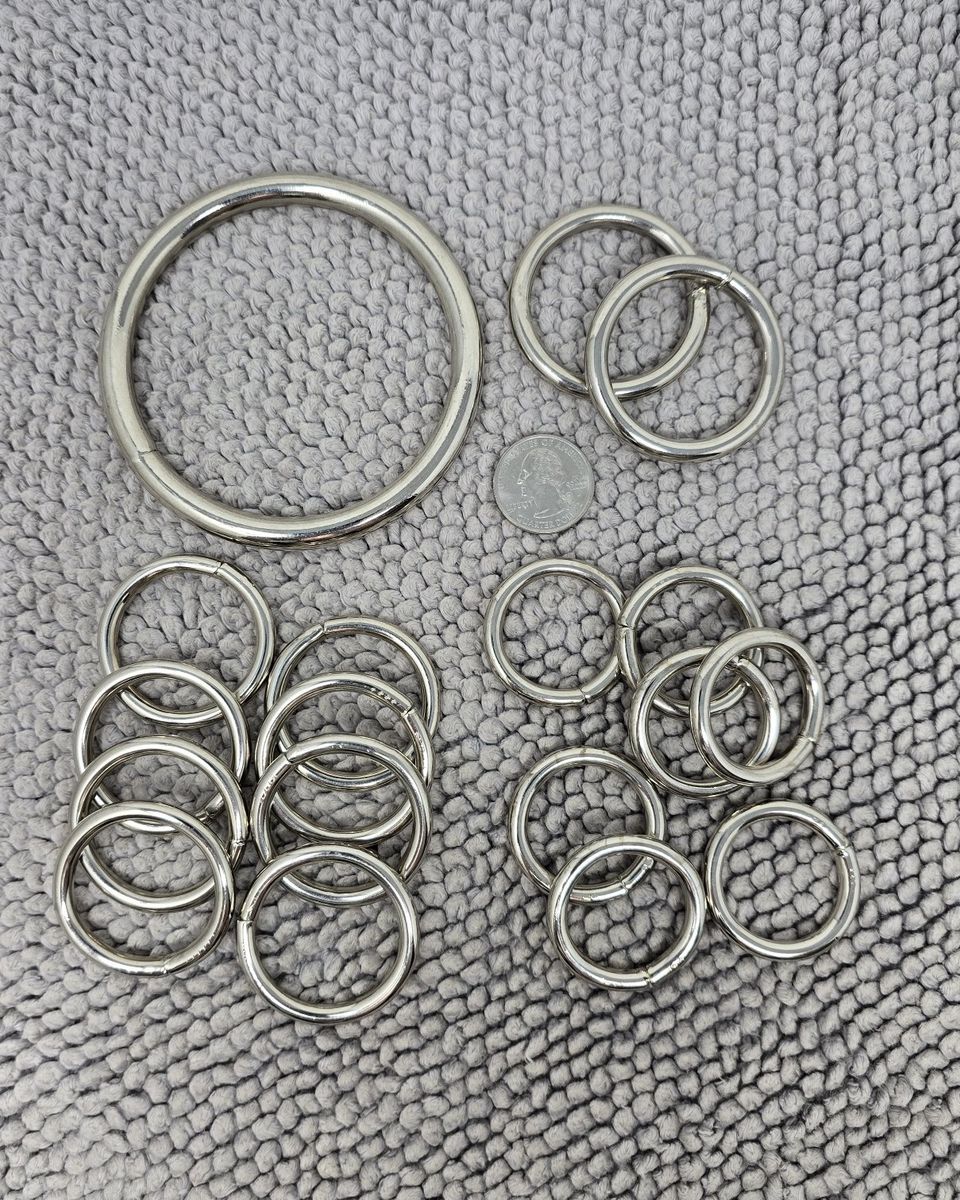 VenmoLarge mixed lot of metal hardware including clips, rings, carabiners, D-rings, and various connectors.