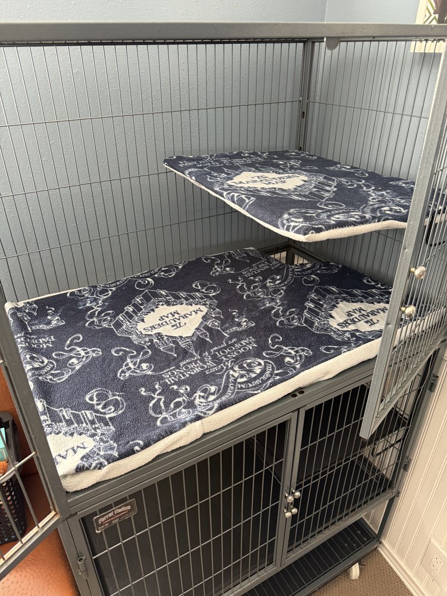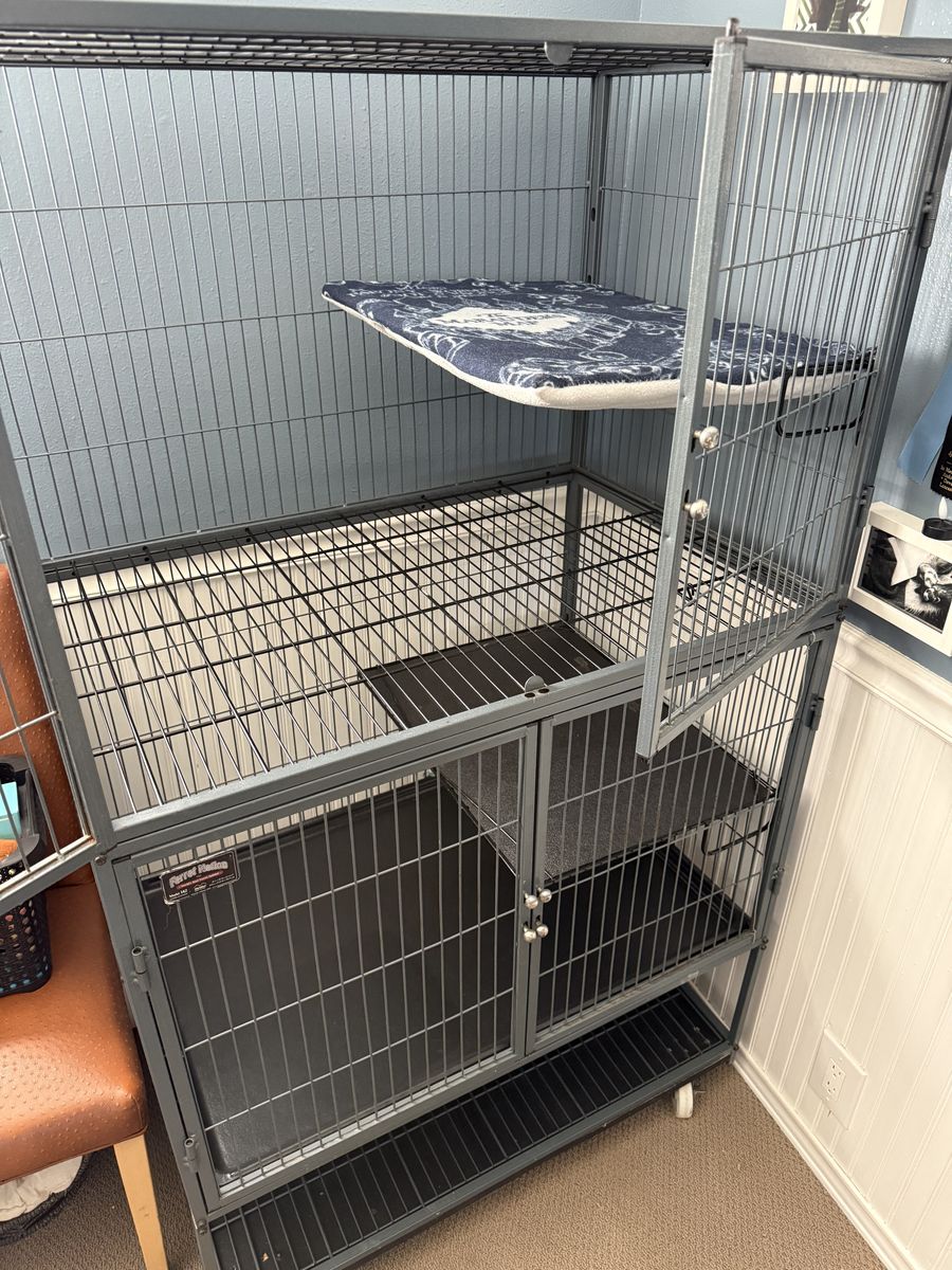 ApplePayFerret Nation Cage Pet cage Small animal Ferret, bunny, rat, chinchilla 36L x 25W x 62.25H 2 sections, 4 levels. 2 section can be separated Storage area underneath 2 inside ramps included Custom fitted shelf covers included $200 obo