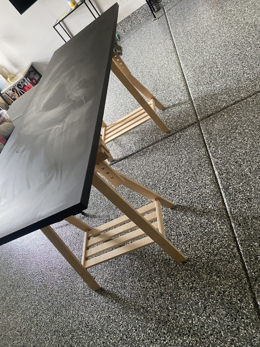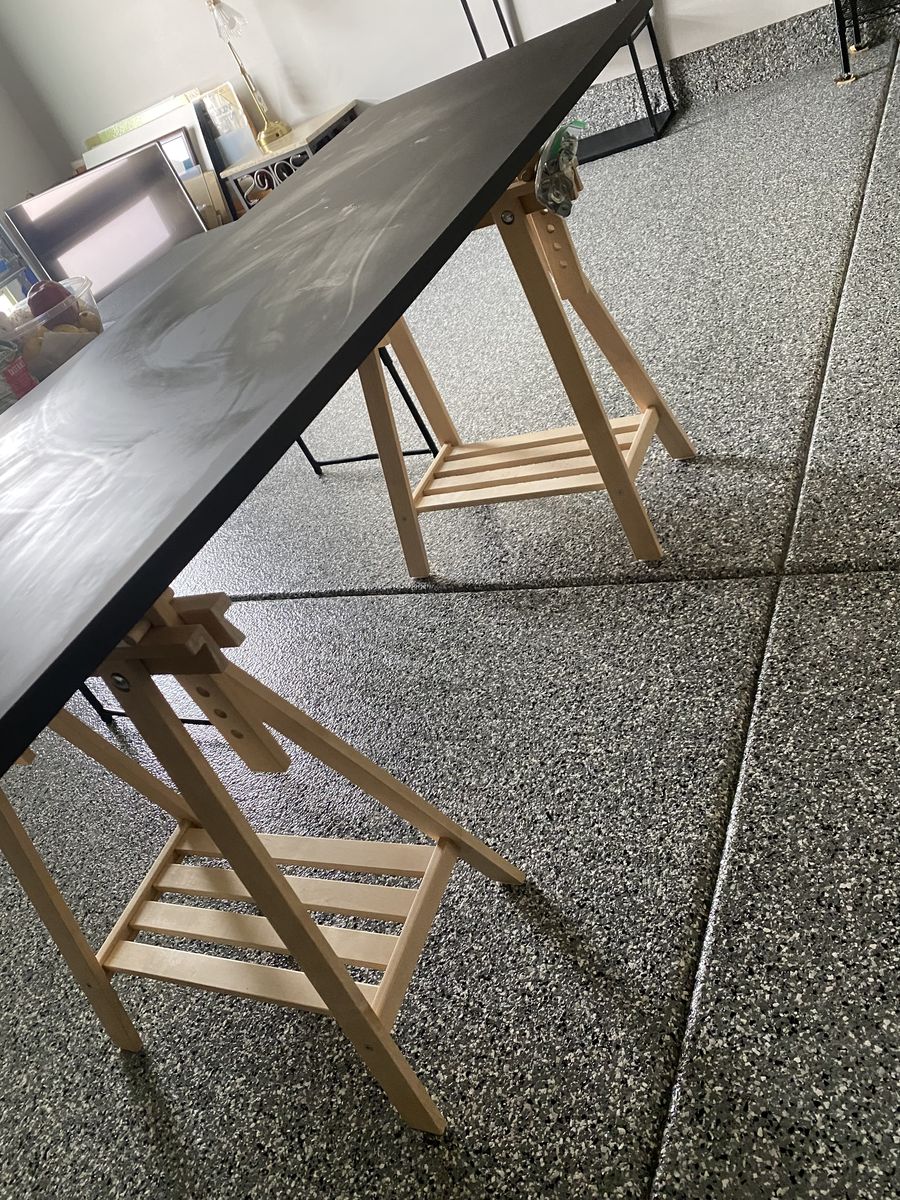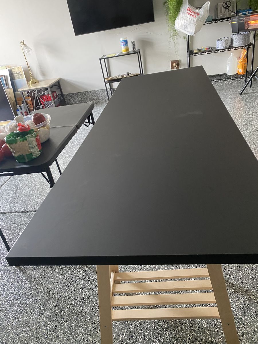 The height is ajustable. The table is an great condition. It was wiped down( cleaned ) so that’s why it looks like that in the picture. The measurements are there with the pictures. You can use this table for any use. For crafts for art or anything.