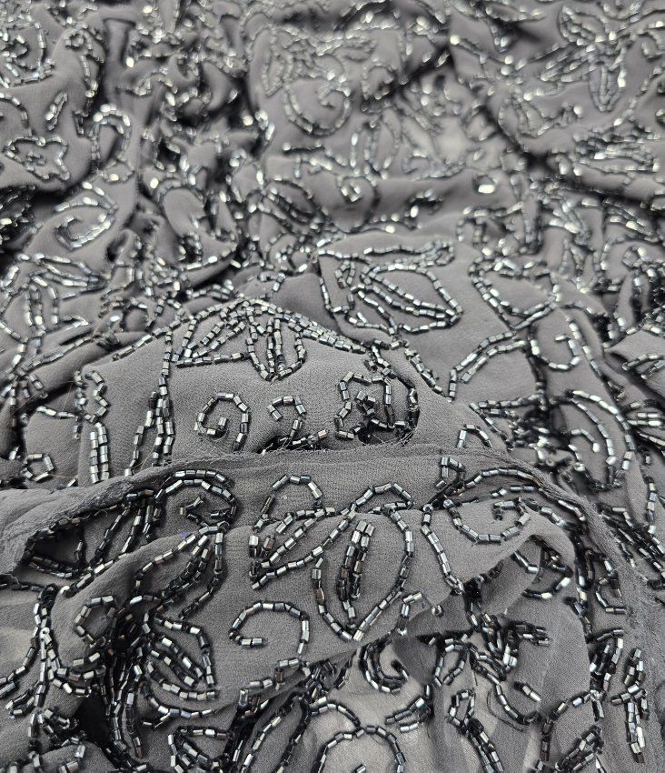 Materials appear to include silk and sheer fabrics with dense hand-applied beadwork.