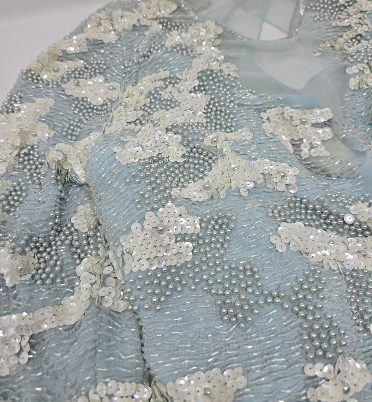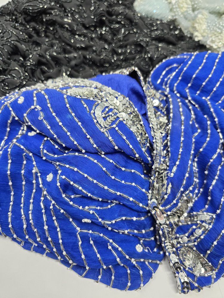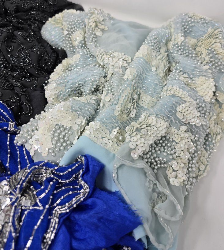 Includes a mix of heavily embellished pieces with glass beads, sequins, and detailed handwork: