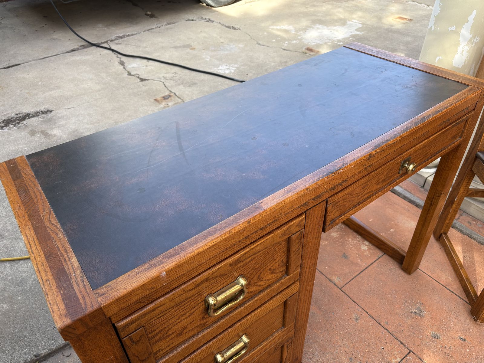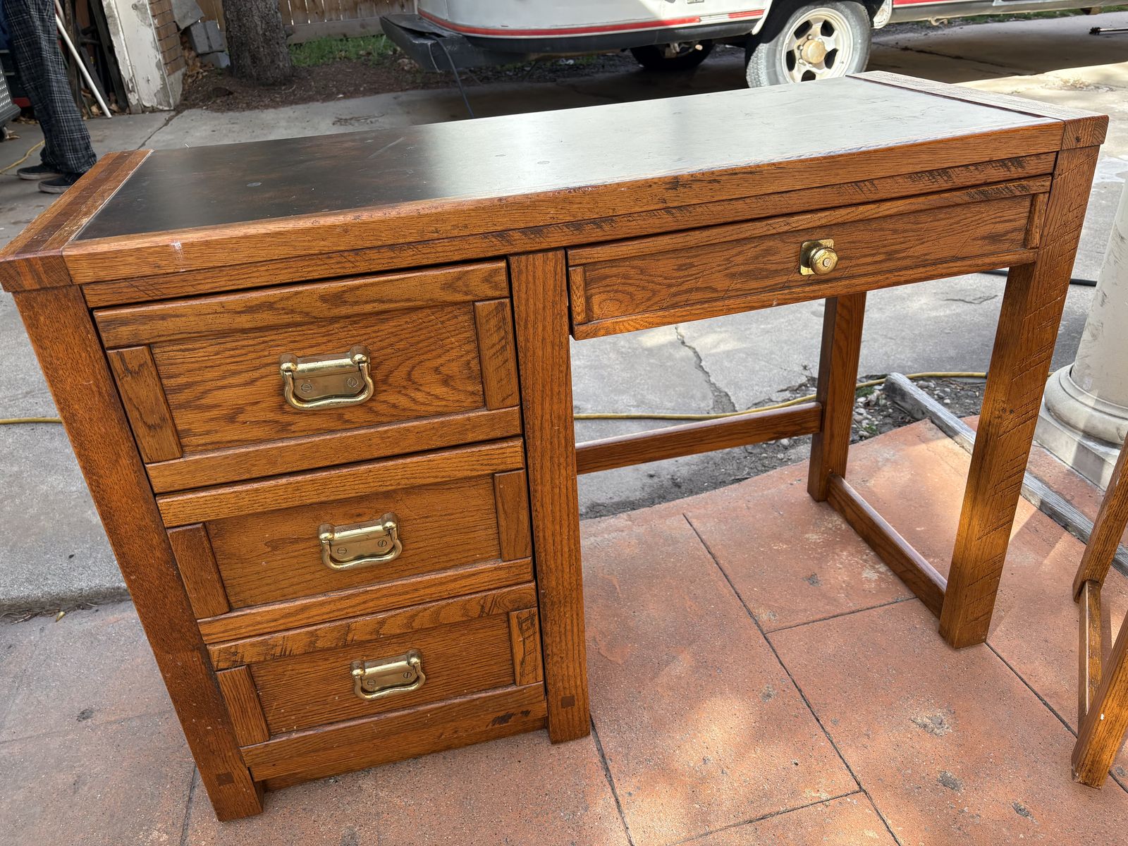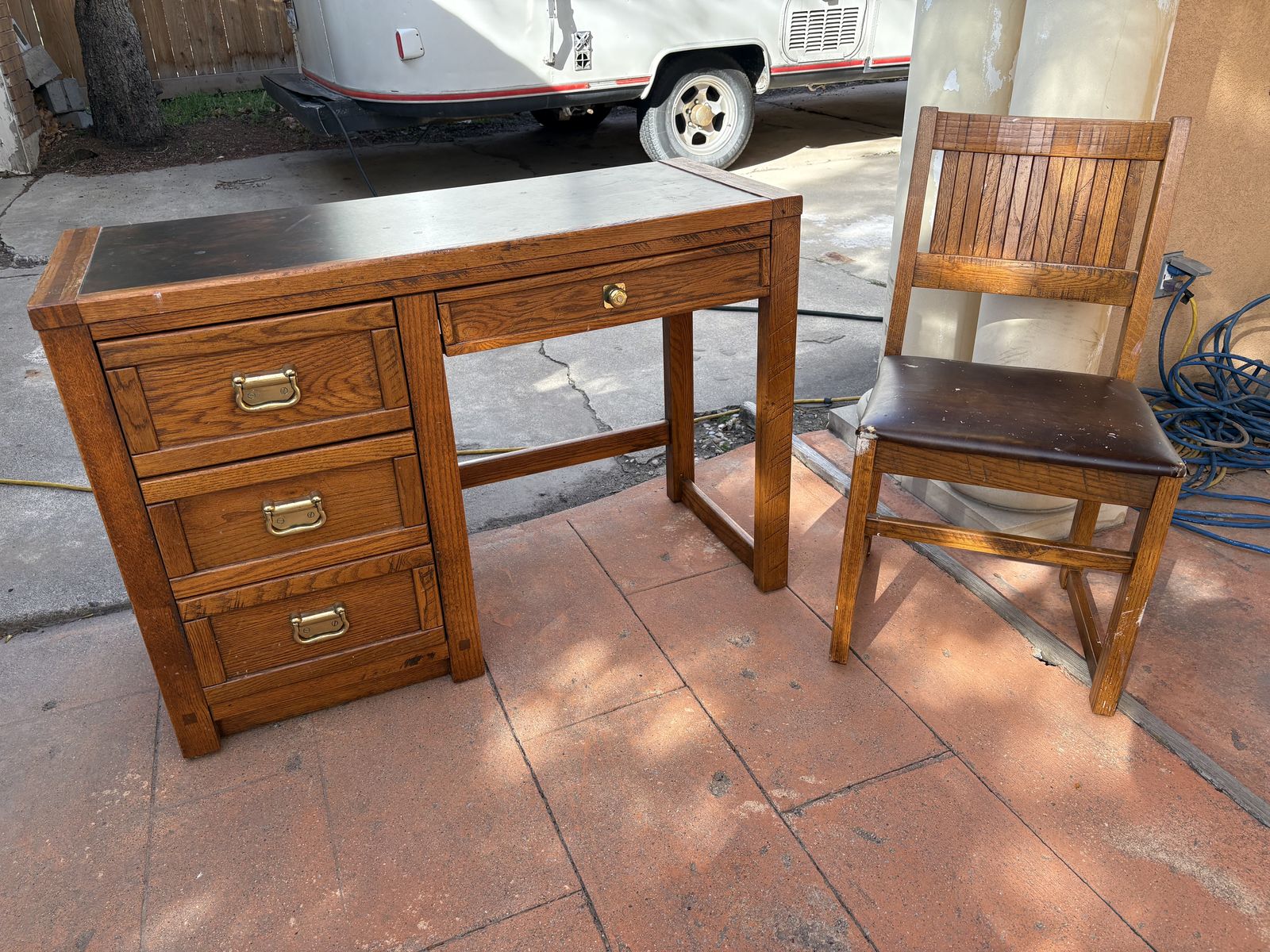 I have a vintage oak mission style desk and chair. I believe they were made by Young Hinkle. It’s a heavy, solid desk that is 43 inches long and just over 18 inches deep. It’s about 30 inches tall. The top looks like leather. It’s in good shape for its age but has a couple of marks on top (see the close up picture). The chair is not in great shape. It has paint on it (see the last picture). See my other ads for jewelry, artwork, home decor and more.