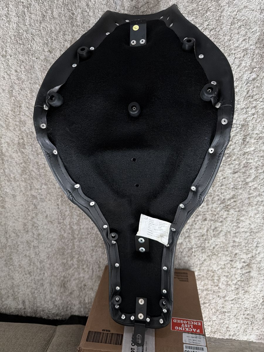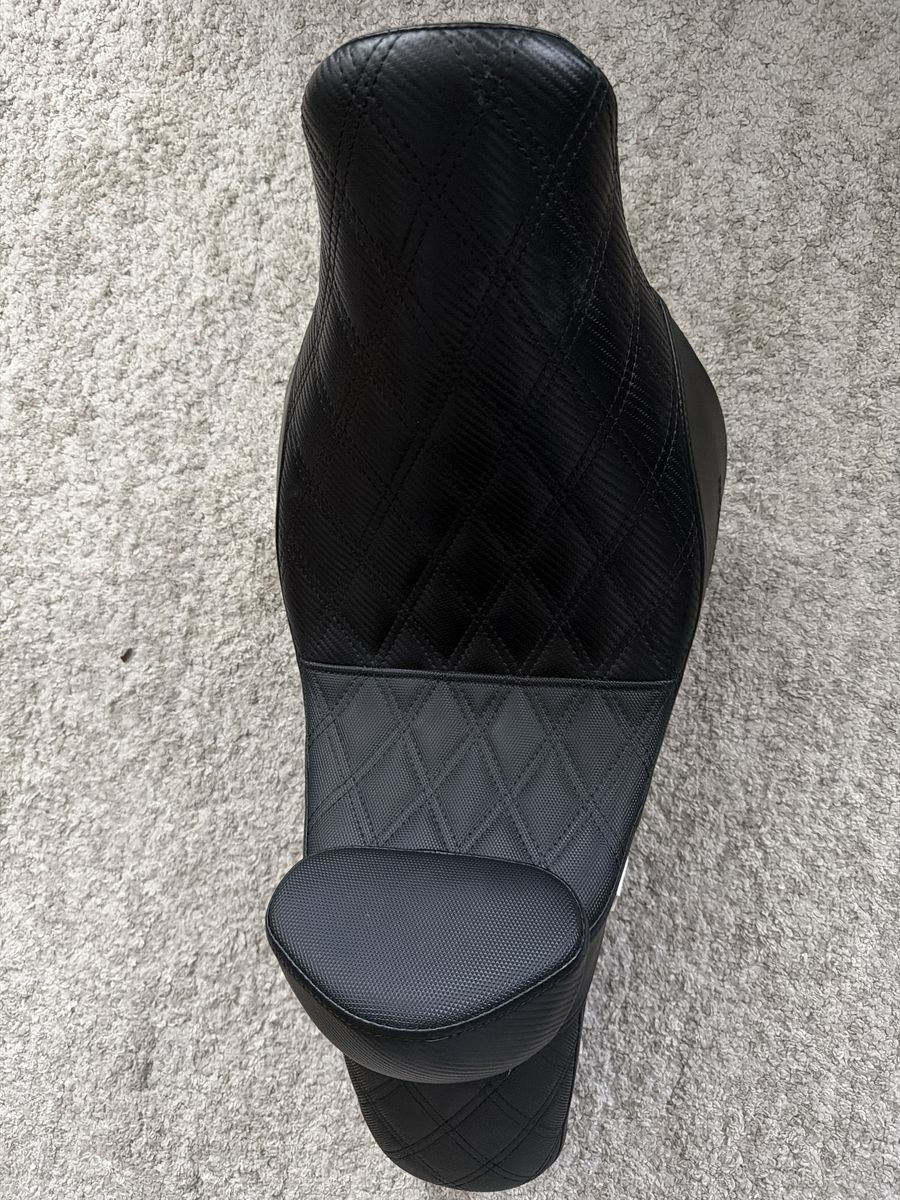 Saddlemen Pro Series SDC Performance Gripper Seat with a driver’s lumbar rest, designed for 2018–2025 Harley-Davidson Softail Low Rider and Sport Glide models. It features GelCore™ technology, black gripper material, and a lattice-stitched design to improve comfort and control.