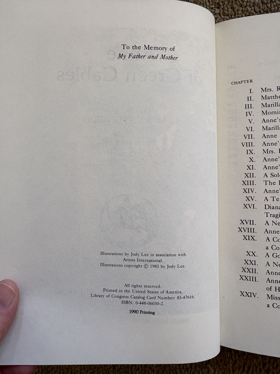 Illustrated Anne of Green Gables, by L. M. (Lucy Maude) Montgomery, illustrated by Jody Lee. Illustrated Junior Library, 1983, 382 pages. Nice hardcover edition of the classic book with beautiful illustrations (both color and black and white). Very good condition—some wear on corners and edges of spine. Text only. Cash or Venmo. Discount on multiple items.