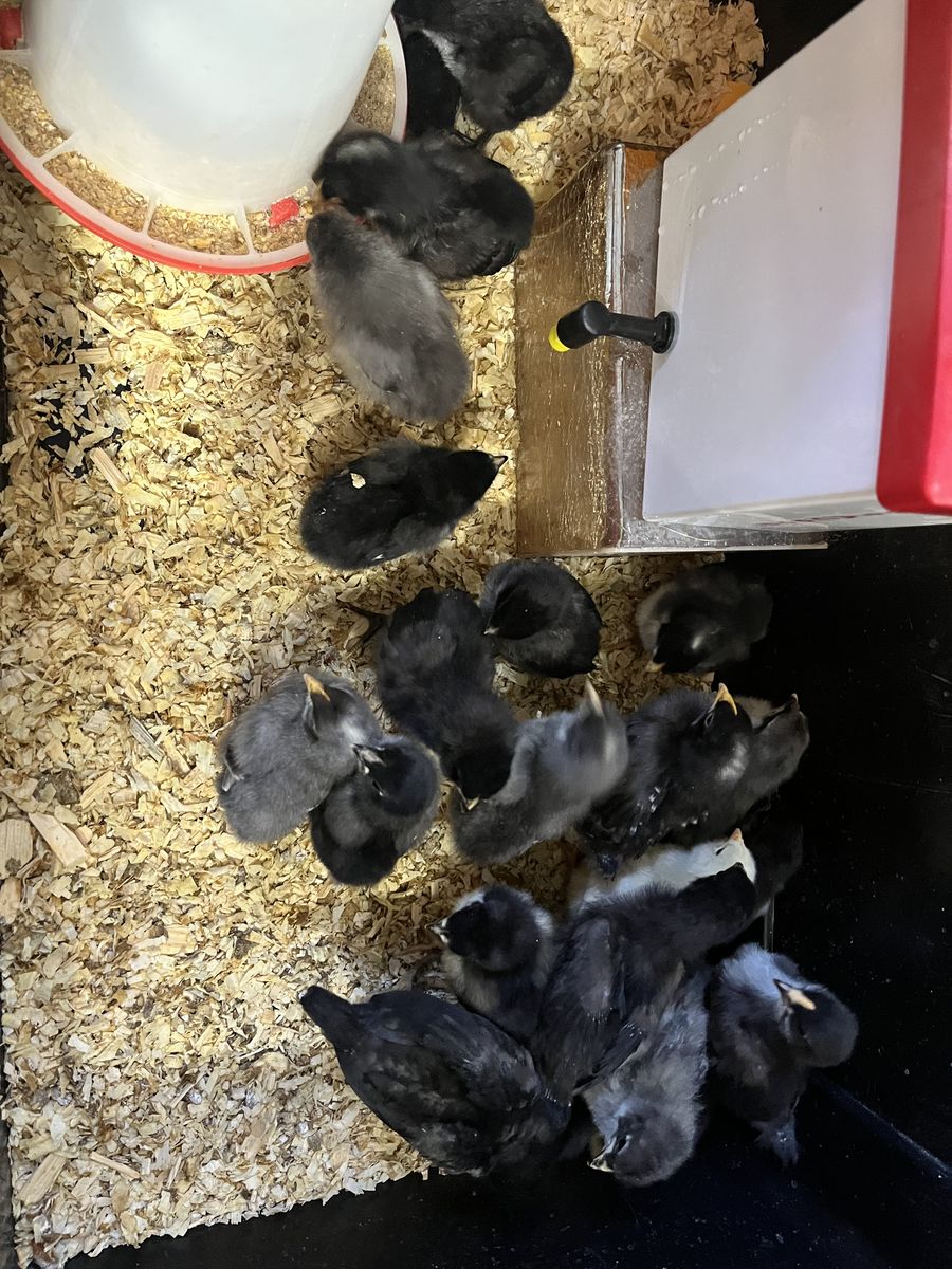 These chicks are French black copper Moran crossed with Whiting true blue, they will lay olive eggs. $3 each. Ready to go I have about 15 left. Straight run.