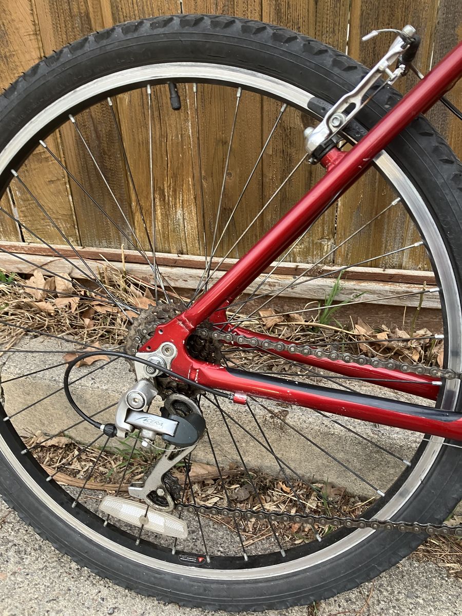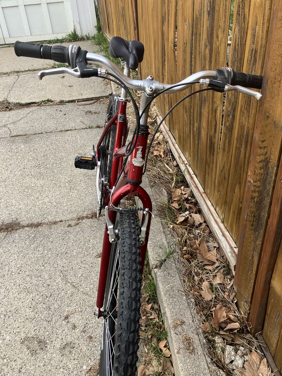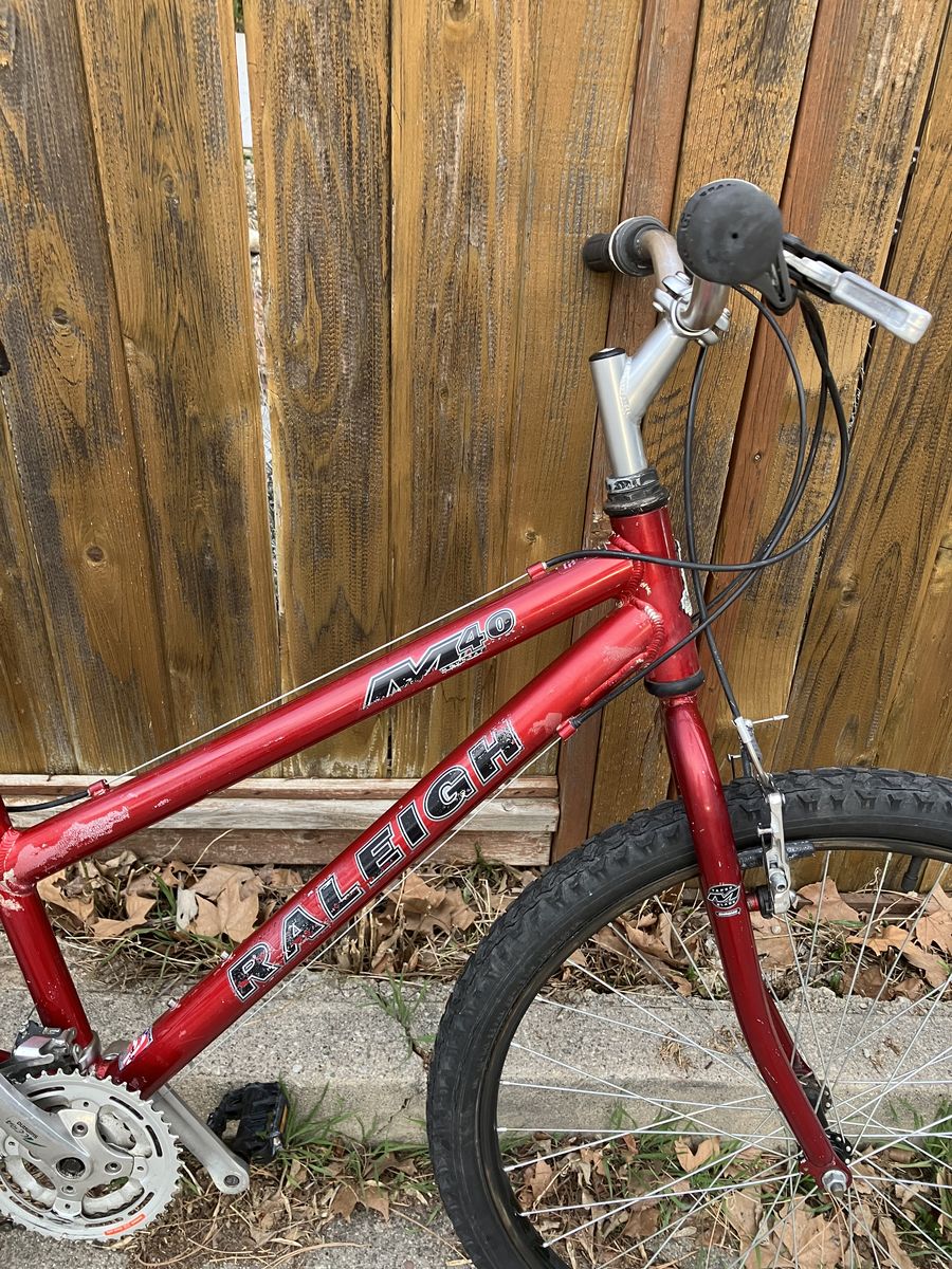 PayPalRaleigh USA M40. 26 ins wheels, 21 speed (3x7) Shimano Acera gears. Twist grips. Nice aluminum frame with cromo forks. Recently tuned. Great commuter.