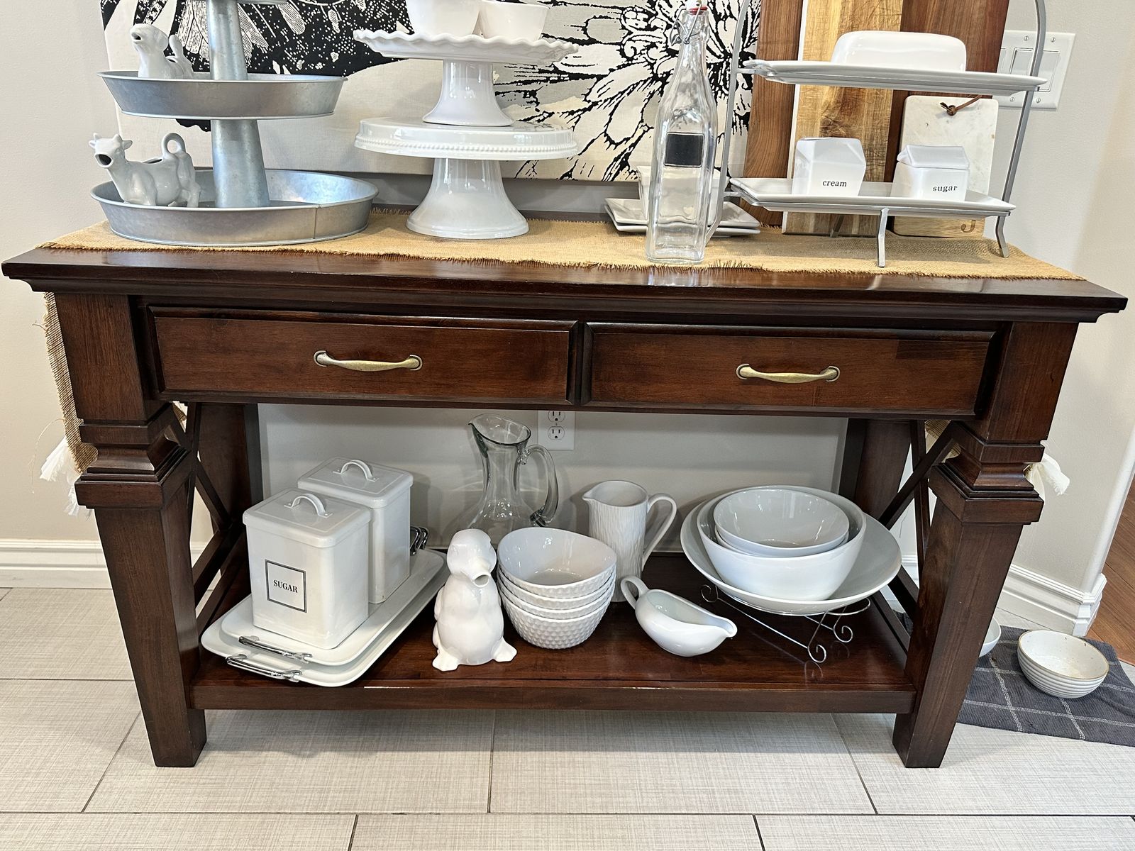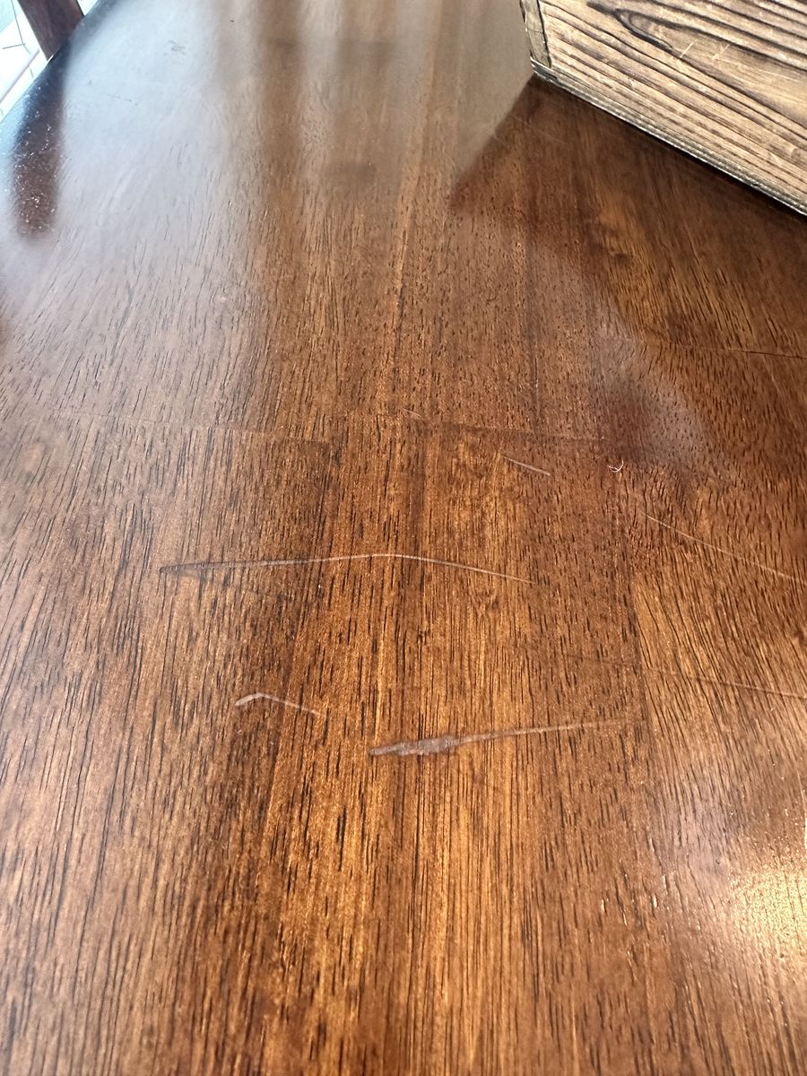 ZelleMatching set- $250 for table and 8 chairs and $100 for console table. Dining table is good used condition with a few minor scratches I’ve filled with dark oil. Console table is nearly brand new condition. Solid wood. Table is 54x54 which includes an 18” removable leaf. Counter height. Console is 30” tall, 54” long and 15” deep. Text 8012590706 for more info. Located in West Jordan