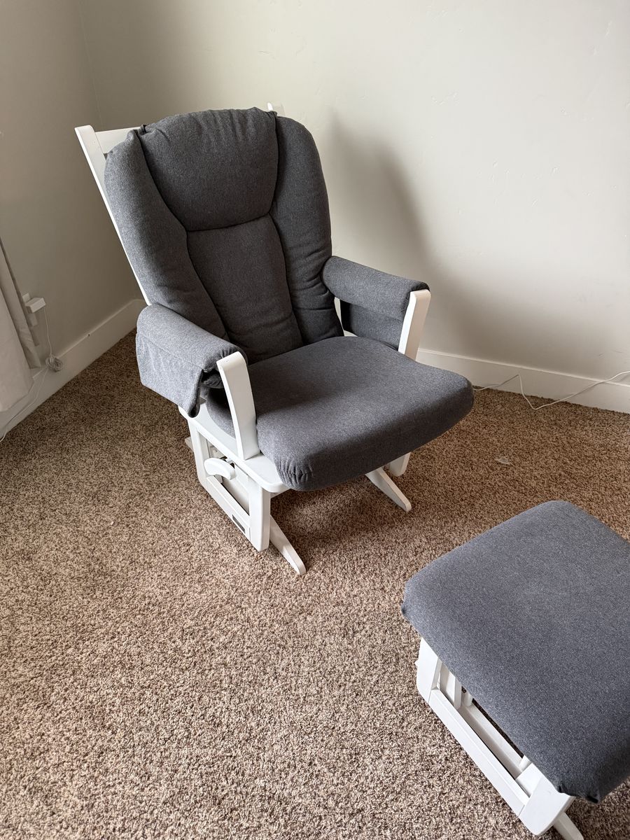 VenmoGood condition white & grey glider/rocking chair with gliding footrest ottoman. Venmo only pickup American fork. Or can deliver for $10 from Orem to Lehi.