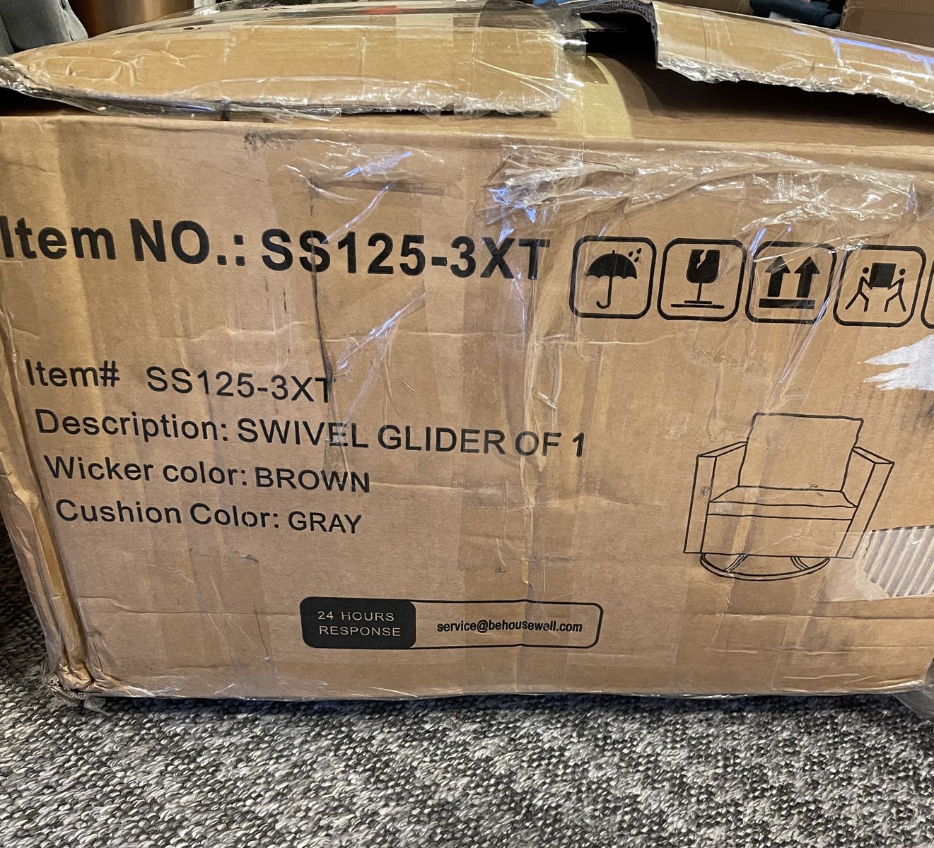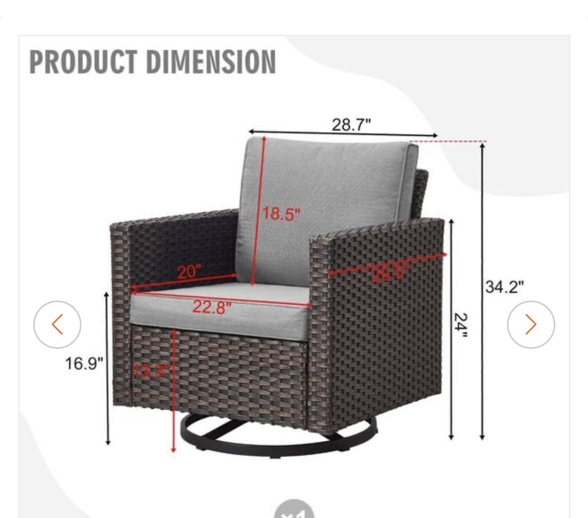 New Brown Swivel Wicker Outdoor Lounge Chair with Gray Cushions. Unassembled in box