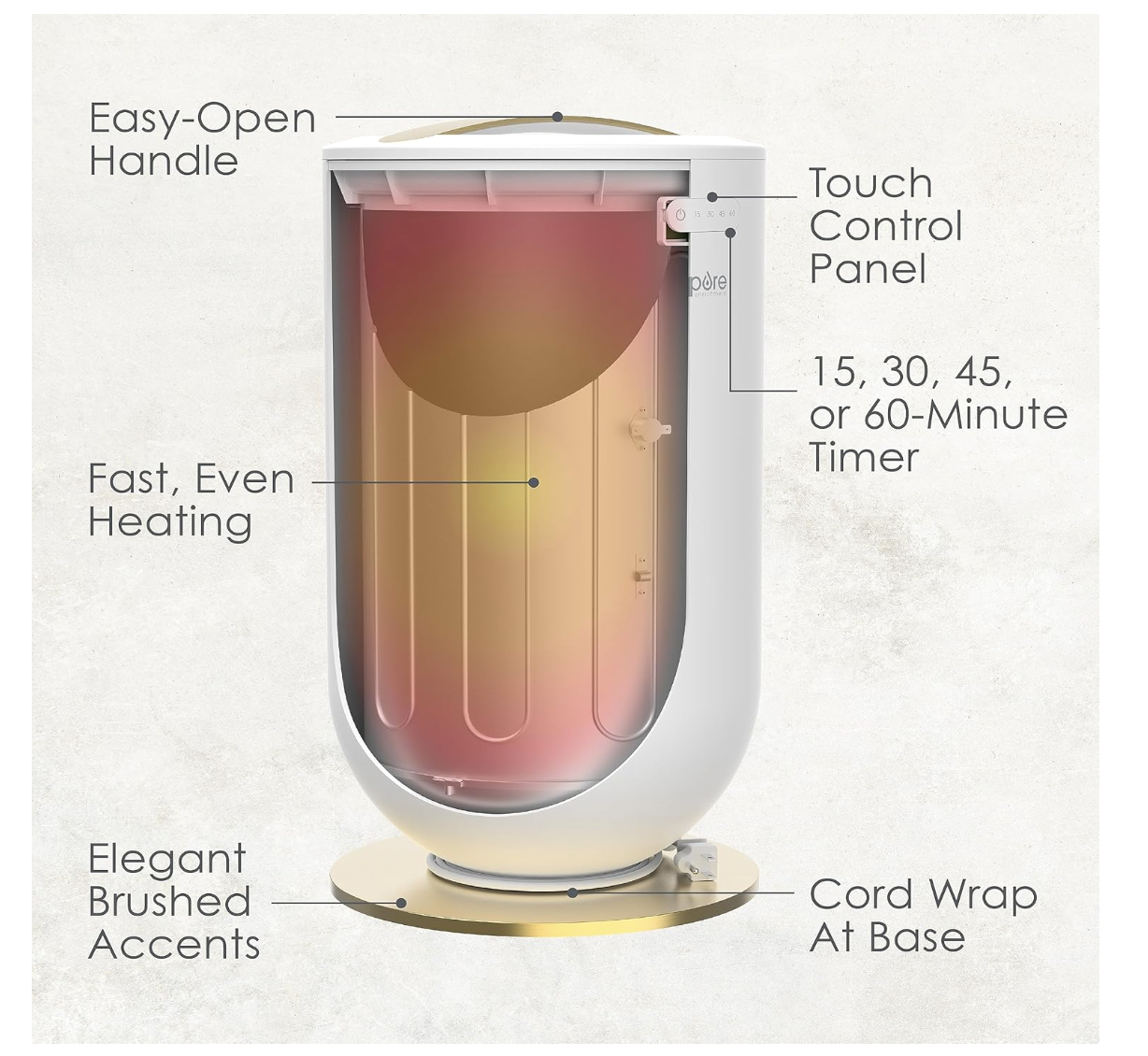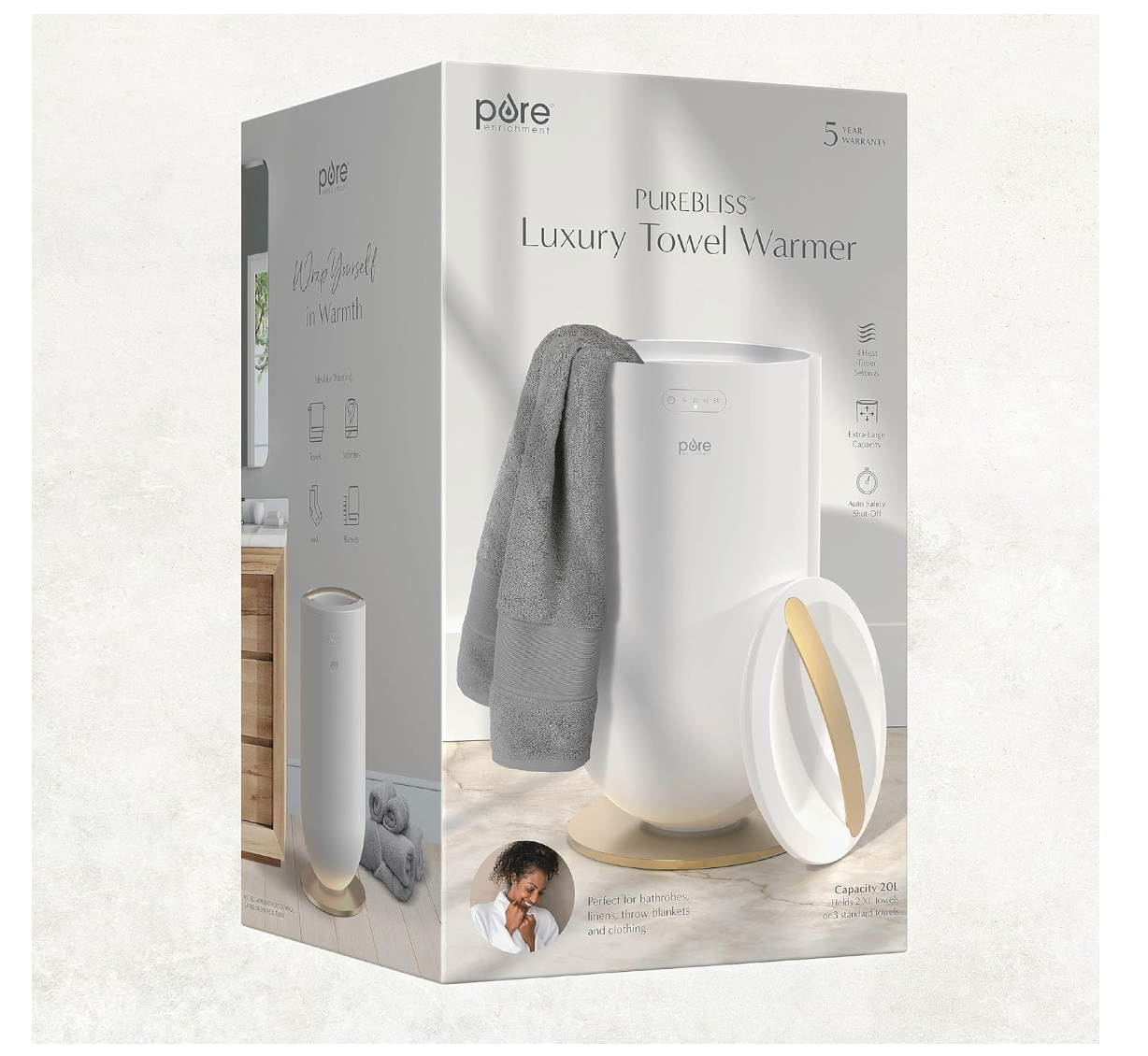 Brand new in box, PureBliss Luxury Towel Warmer - Extra Large 20L Heats Towels, Robes, Blankets, or Clothing - Modern Bucket Design, 4 Heat Timer Settings & Auto Shut-Off (White & Brushed Gold) Extra-Large Capacity: Indulge in cozy relaxation with a spacious 20-liter luxury towel warmer that can hold towels, bathrobes, throw blankets, or clothing, with extra room for smaller items. Designed for warming everyday cotton items, roll or loosely add a variety of items to elevate everyday routines. For an optimal fit, try two extra-large bath towels measuring 40” x 70”, three regular bath towels measuring 30” x 56”, or a large throw blanket measuring 50” x 60”. 4 Heat Timer Settings: Evenly heat towels & clothing for 15, 30, 45, or 60 minutes with the modern and intuitive touch button controls. The heated towel warmer gives an audible beep and automatically shuts off after the warming cycle is complete for added safety. Sleek & Modern Design: Elevate your at-home routines to spa-like experiences with this elegant luxury towel warmer. Designed with modern aesthetics in mind, this space-saving warmer features metallic-like gold or silver brushed accents to compliment any space in your home. Perfect for Every Day: Make every day more luxurious with a hot towel warmer that can be used in a variety of spaces and in a variety of ways. Enjoy toasty towels after a refreshing bath or shower, cozy up with a warm blanket when staying in for the night, or slip into comfy pajamas and socks when relaxing in the bedroom during a chilly evening. Plus, it doesn’t have to end there – this versatile towel warmer could be used in hotels, salons, wellness centers, spas, yoga studios, and more