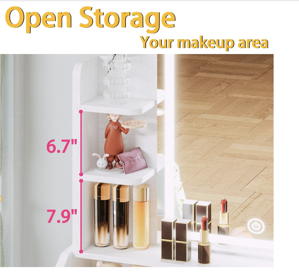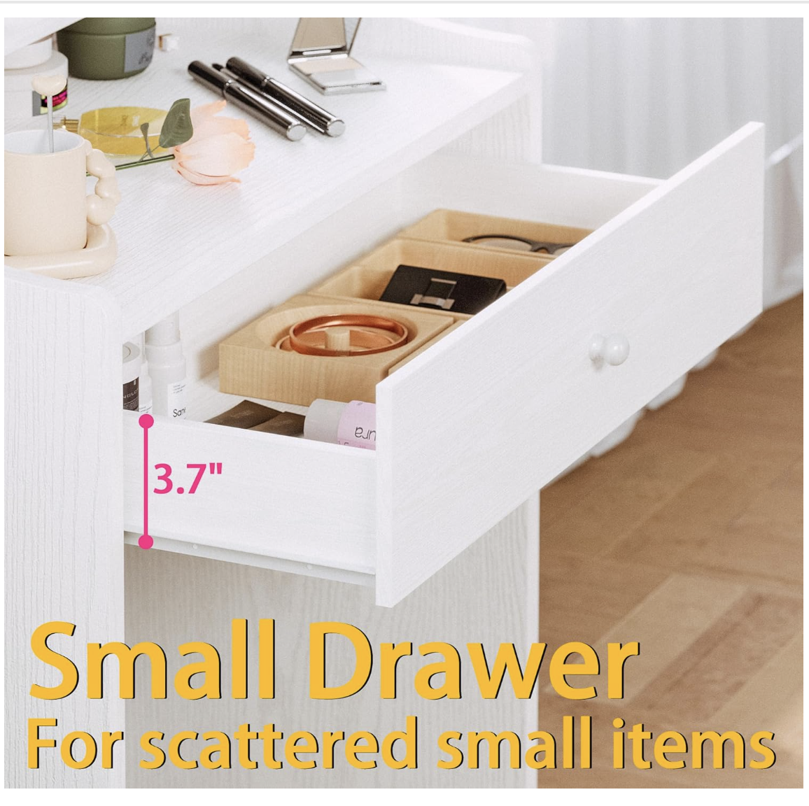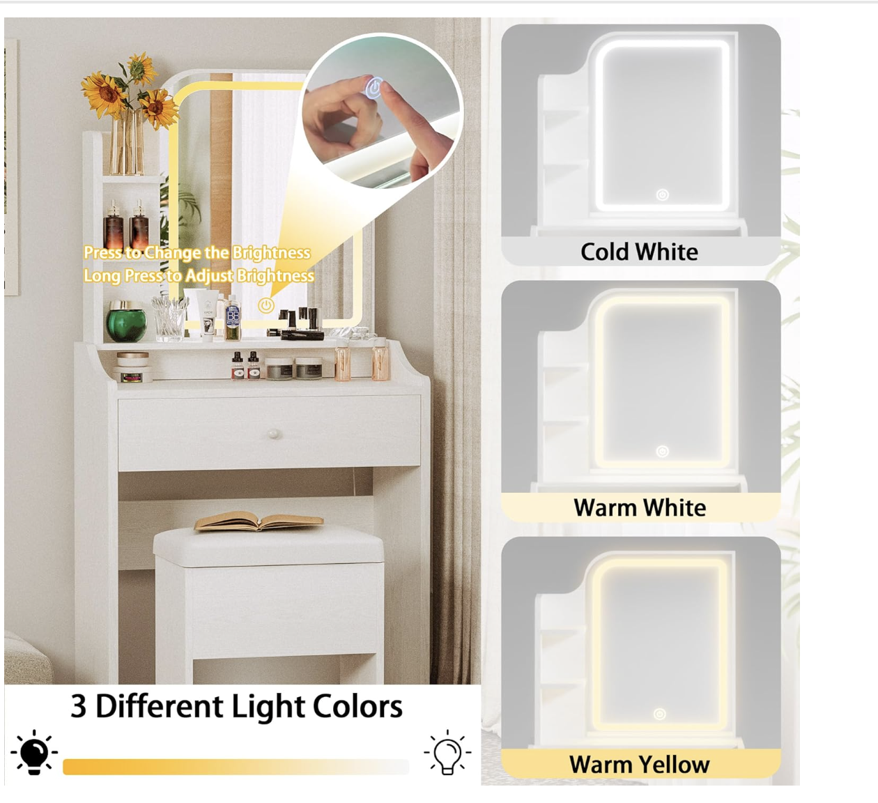 Brand new in box, unassembled, Small Makeup Vanity Desk with Mirror and Lights, Vanity Table Set with Storage Drawer, Chair and Three Shelves, Bedroom, White..Product Dimensions 15.4 x 24.4 x 59 inches Small and Functional Design: Our vanity has a small footprint and is functional, keeping your grooming essentials organized and within reach Easy to sign and install: It is small in size and light in weight, and one person can easily take it home or upstairs, with all installation tools included, the installation is super simple Built-in mirror and lighting: Making it convenient for you to get ready in the morning or for a night out, the adjustable lighting allows you to create the perfect ambiance for your beauty routine Durable and long-lasting: Our makeup vanity is crafted from high-quality materials, ensuring their durability and longevity Stylish and Versatile: Equipped with a charging station, convenient for charging hair dryers, mobile phones and other devices, Its smooth curved design is safe and adds a touch of elegance and sophistication to your bedroom