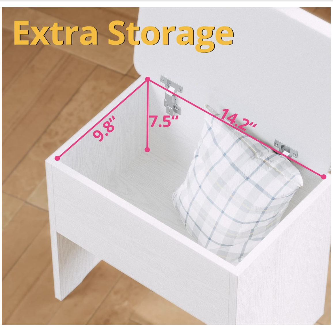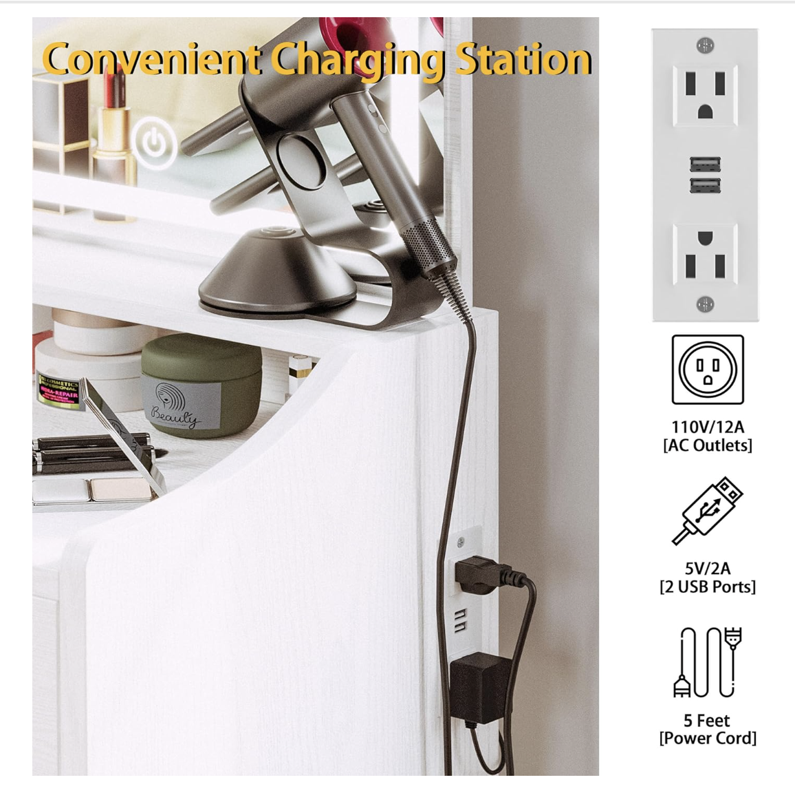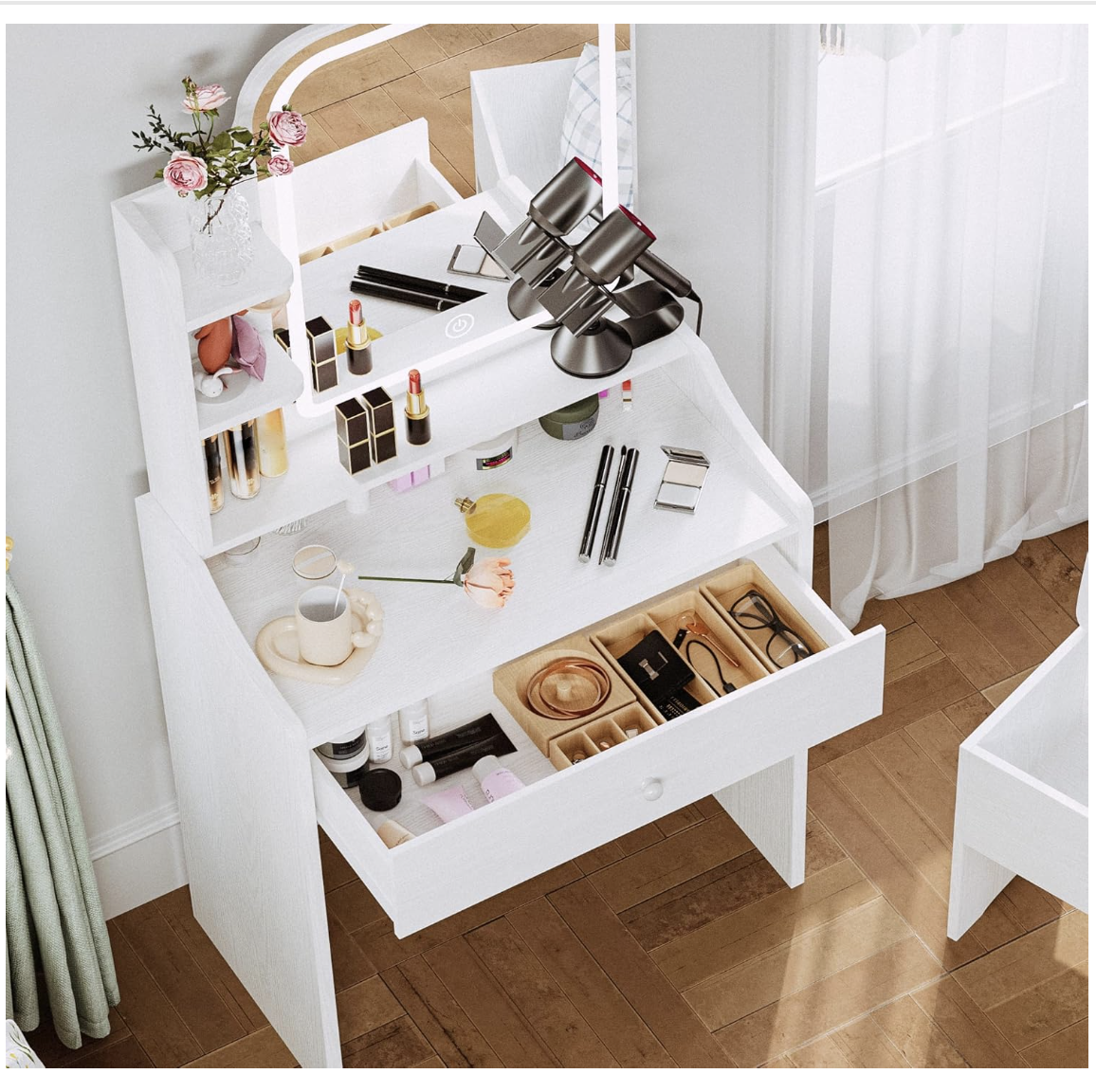 Brand new in box, unassembled, Small Makeup Vanity Desk with Mirror and Lights, Vanity Table Set with Storage Drawer, Chair and Three Shelves, Bedroom, White..Product Dimensions 15.4 x 24.4 x 59 inches Small and Functional Design: Our vanity has a small footprint and is functional, keeping your grooming essentials organized and within reach Easy to sign and install: It is small in size and light in weight, and one person can easily take it home or upstairs, with all installation tools included, the installation is super simple Built-in mirror and lighting: Making it convenient for you to get ready in the morning or for a night out, the adjustable lighting allows you to create the perfect ambiance for your beauty routine Durable and long-lasting: Our makeup vanity is crafted from high-quality materials, ensuring their durability and longevity Stylish and Versatile: Equipped with a charging station, convenient for charging hair dryers, mobile phones and other devices, Its smooth curved design is safe and adds a touch of elegance and sophistication to your bedroom