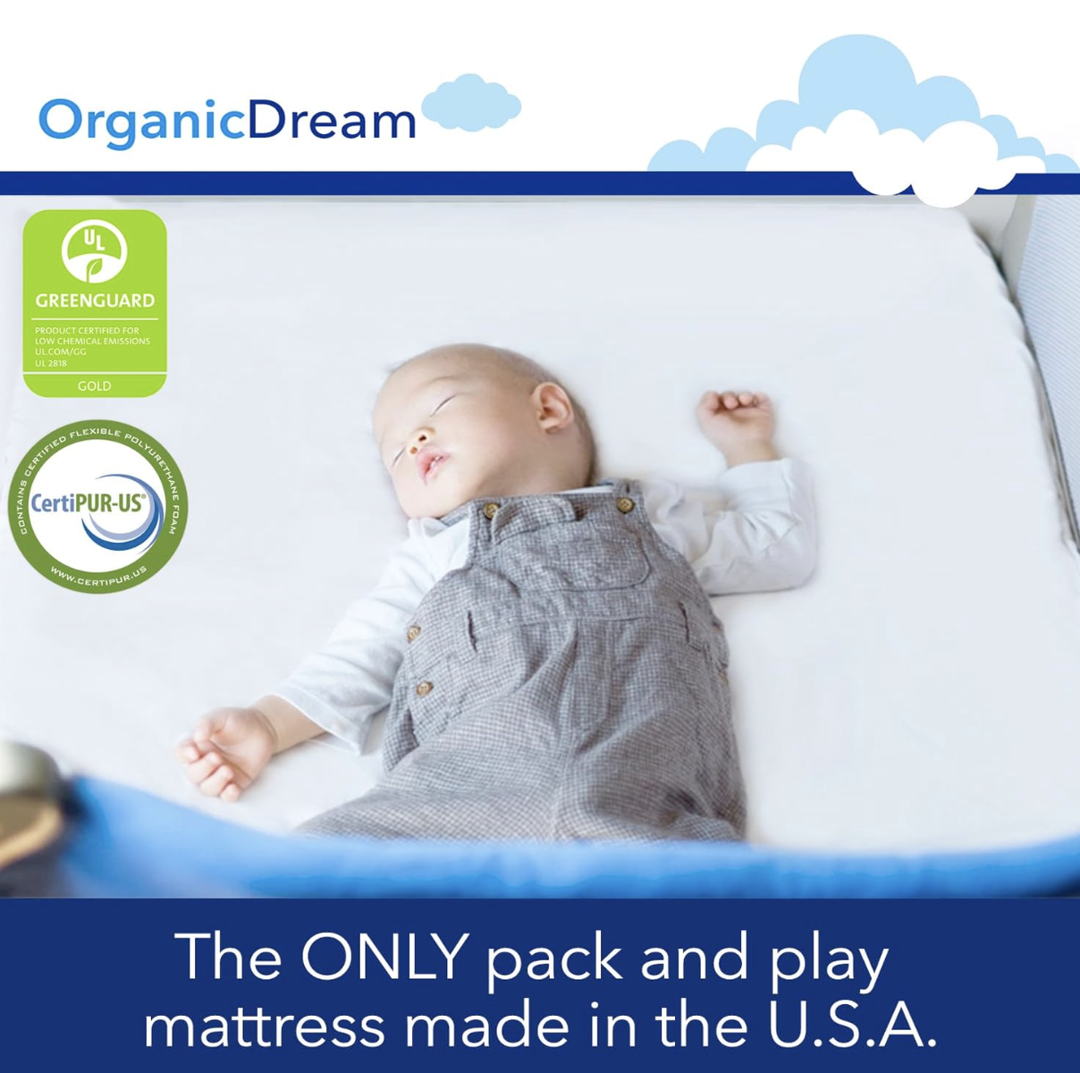 38"L x 1.5"W x 26"Th FOR PACK N PLAYS: FITS GRACO PLAYARDS PERFECTLY (38" x 26" x 1.50"). When it comes to your infant and toddler, we know that safety comes first. Our mattress pads are GreenGuard GOLD Certified. That means that our play yard mattress pads have gone through rigorous testing for VOCs, chemical emissions, or synthetic chemicals. MADE IN USA: We hold ourselves to the highest standard when sourcing and manufacturing the materials we use for our baby bed mattresses. Our pack n play mattresses are proudly made in the USA using high-quality domestic and imported materials. DUAL SIDED 2-STAGE PACK AND PLAY MATTRESS TOPPER: Designed with a Firm Side for infants and a Soft Side for toddlers, this mattress pad grows with your baby to provide comfort and support. The toddler side features CertiPUR-USA high-density memory foam. ALWAYS BREATHABLE: With each layer of the Organic Dream crib playard mattress topper, we've ensured that this firm but soft sleep pad is 100% breathable. This offers ongoing airflow, which is proven to reduce the risk of suffocation. Parenthood is full of challenges; rest easy when you buy Organic Dream. Designed for safe
