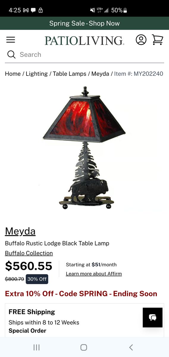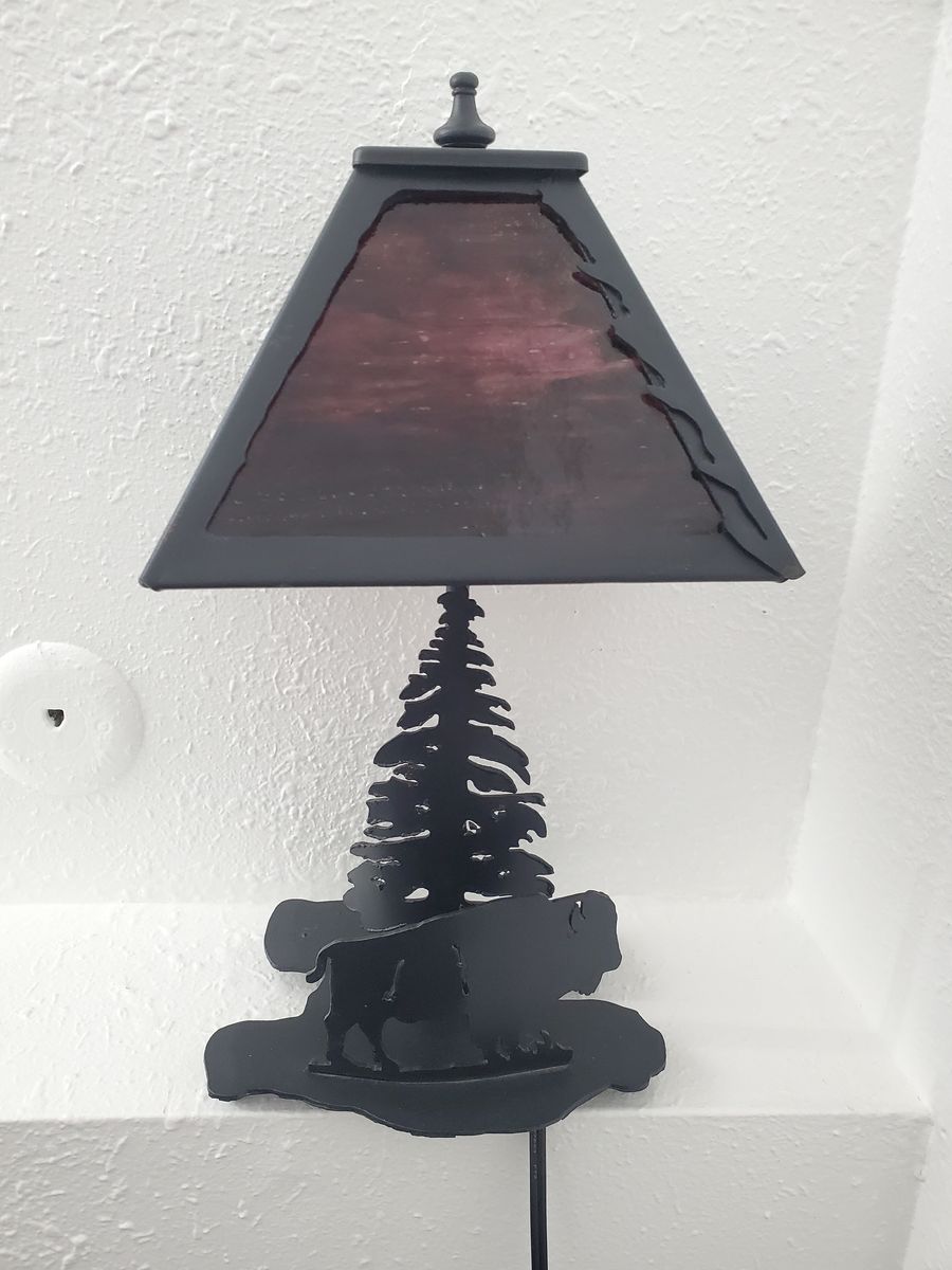A leaf edged linear square shade sits above Buffalo and pine tree lamp base. The wildlife inspired accent lamp has a Textured Black finish with Burgundy art glass panels and is handcrafted in the USA by Meyda artisans.
