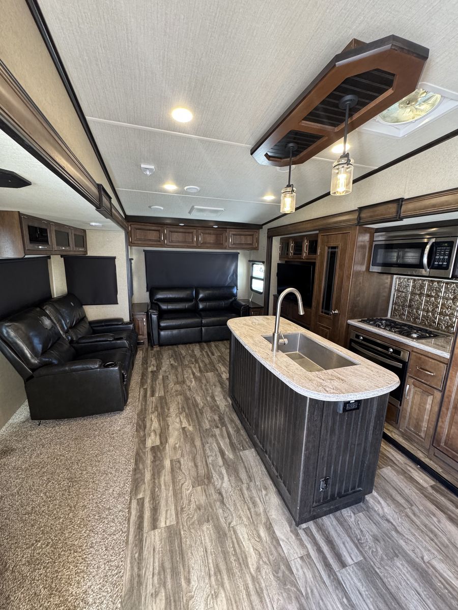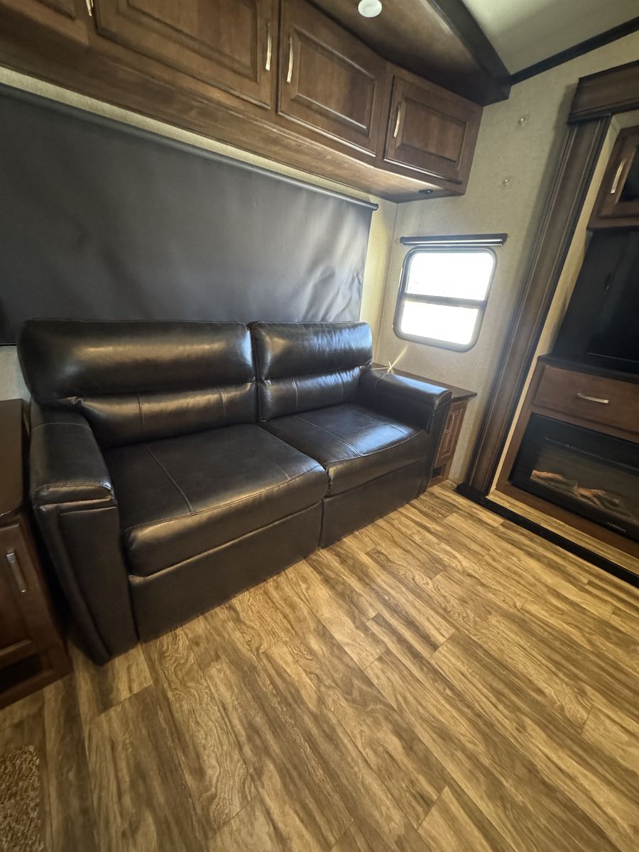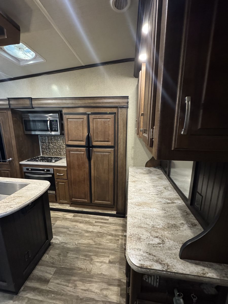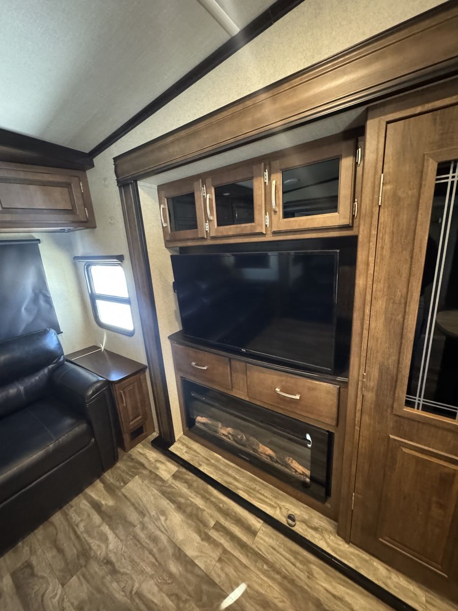 The 2018 Grand Design Reflection 303RLS is a luxurious fifth wheel trailer that offers a spacious and comfortable living space for travel enthusiasts. This model is designed with attention to detail and features high-quality materials throughout. The interior layout is thoughtfully planned to maximize space and functionality, with ample storage options and modern amenities. The living area is equipped with cozy seating, and a well-appointed kitchen with all the necessary appliances for a home-cooked meal on the road.