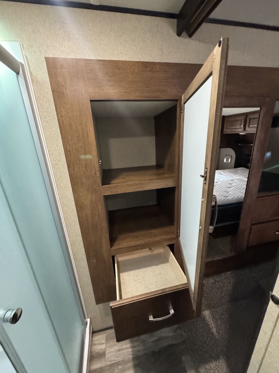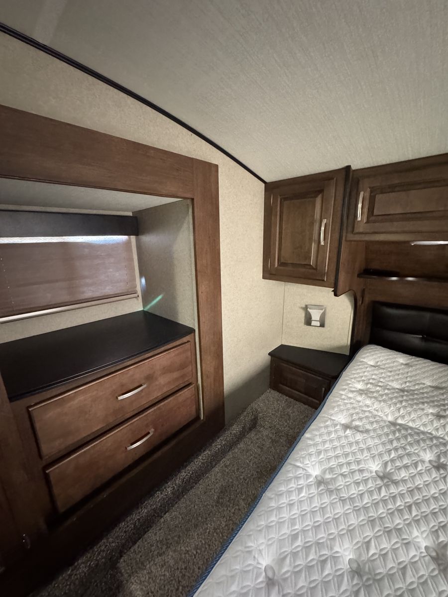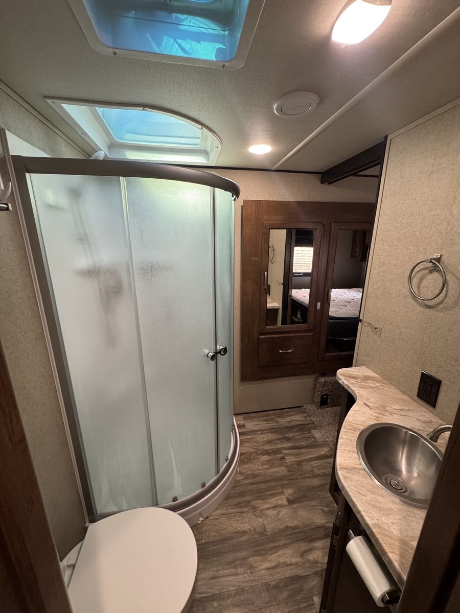 The bedroom includes a comfortable queen-size bed and plenty of storage for clothing and personal items. The bathroom features a shower, toilet, and sink, along with additional storage cabinets. This model also includes a power awning, outdoor speakers, and hookups for a TV and entertainment system.