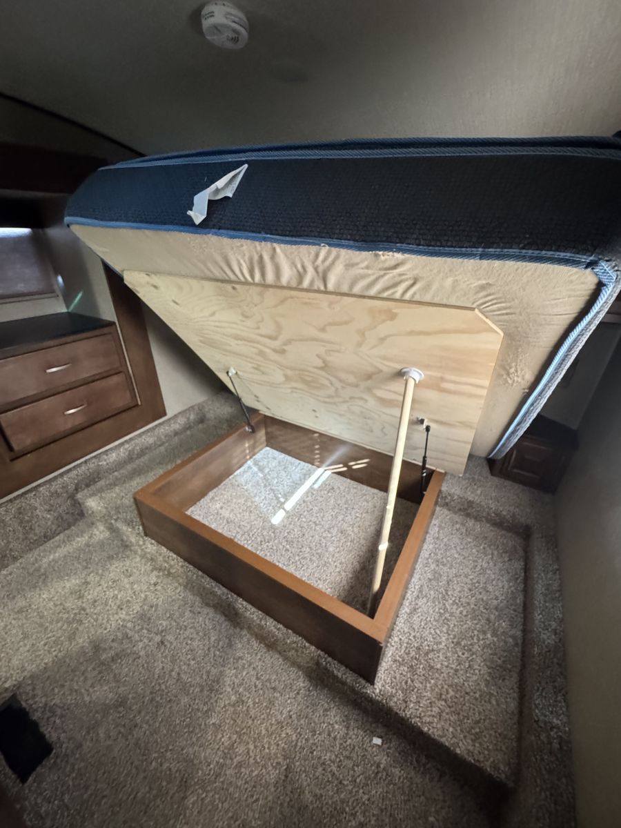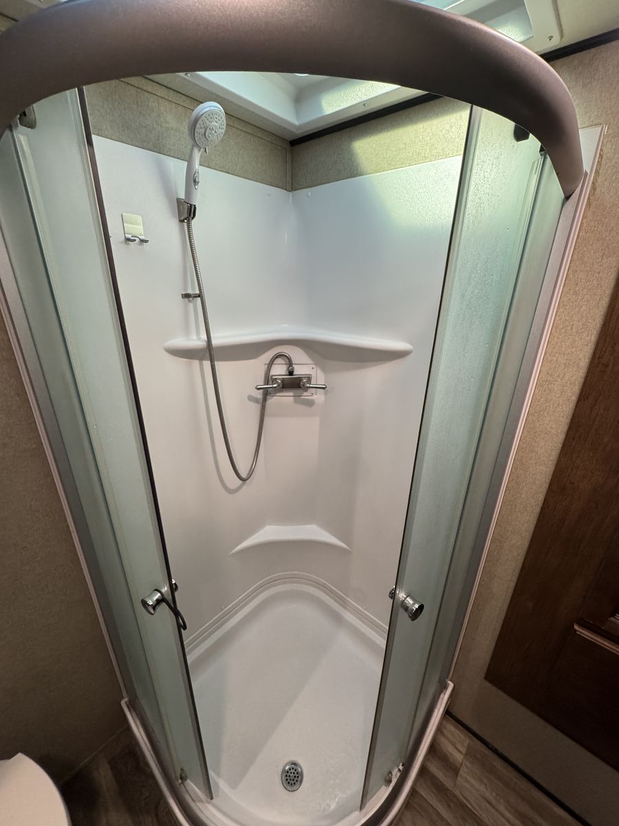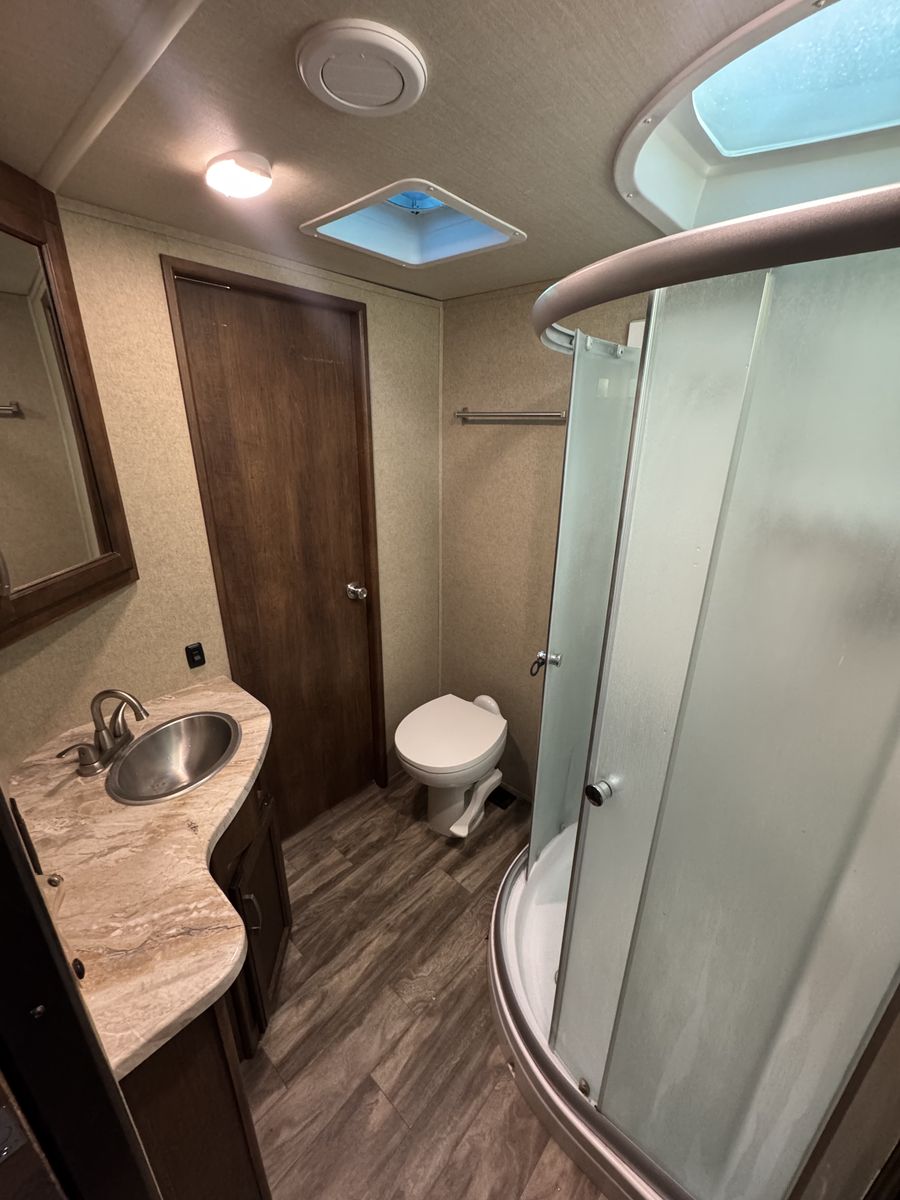 The bedroom includes a comfortable queen-size bed and plenty of storage for clothing and personal items. The bathroom features a shower, toilet, and sink, along with additional storage cabinets. This model also includes a power awning, outdoor speakers, and hookups for a TV and entertainment system.
