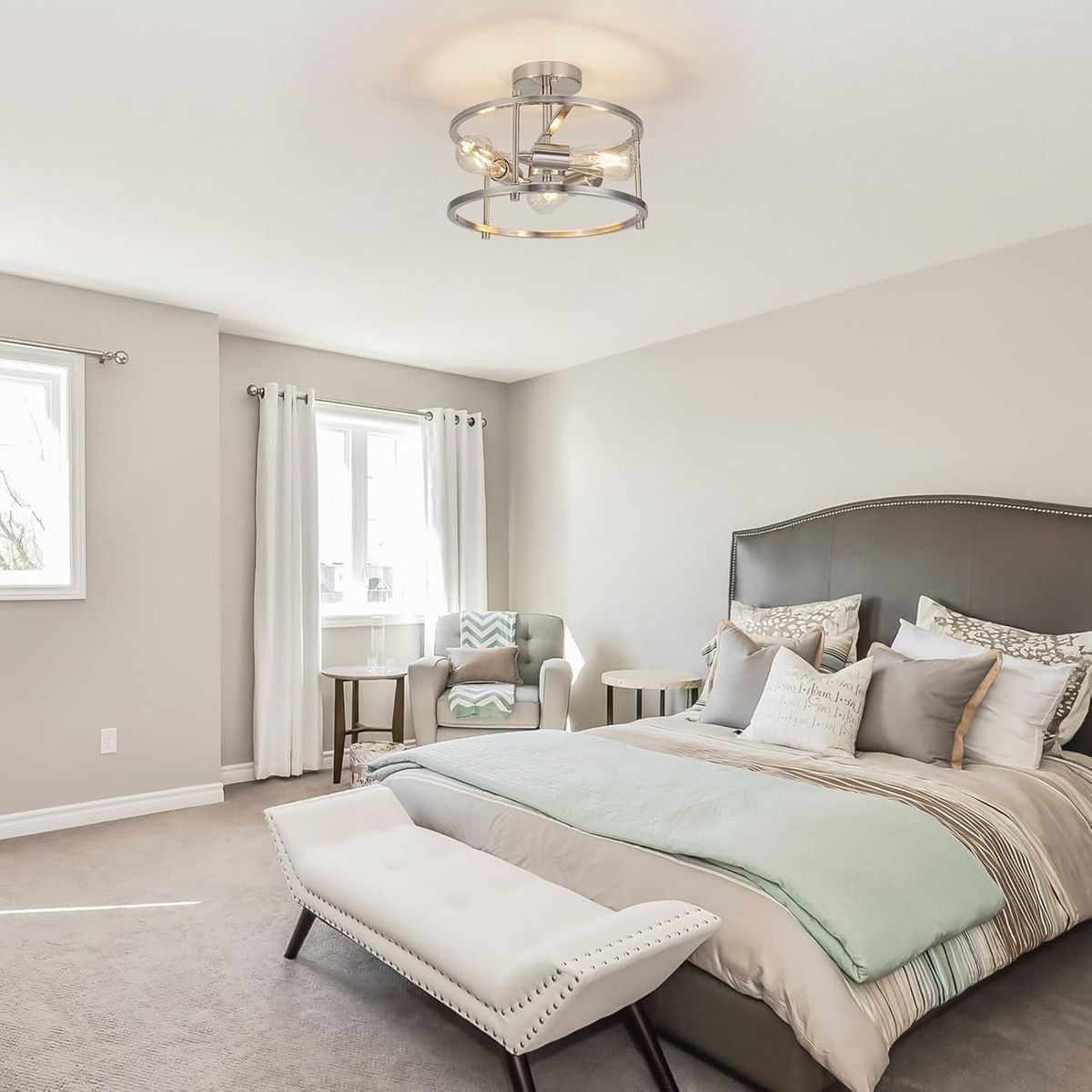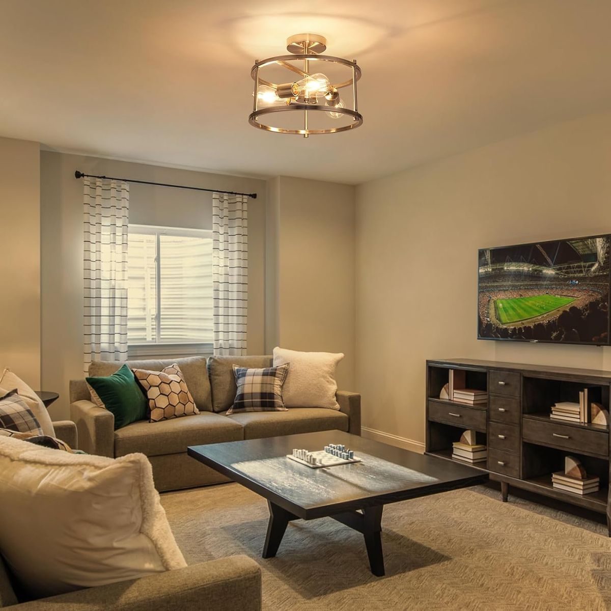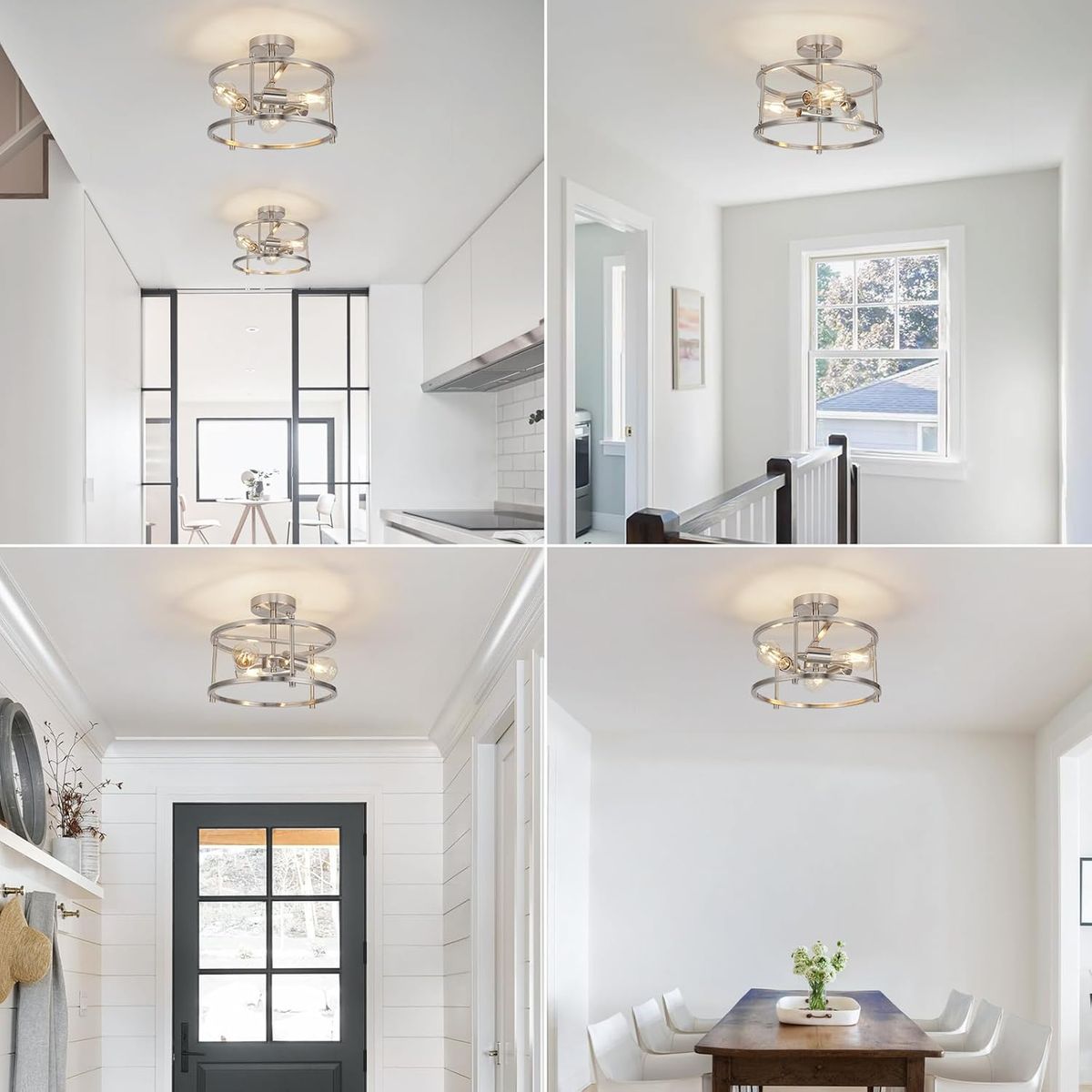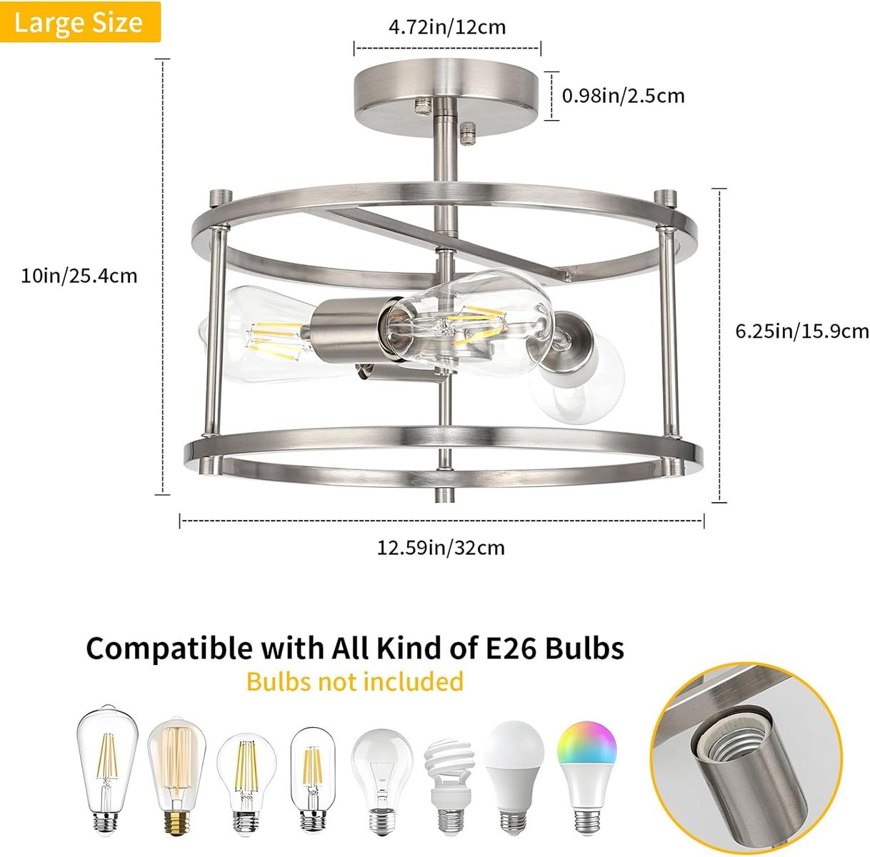 About this item - Semi Brushed Nickel Flush Mount Ceiling Light 3 light semi flush mount ceiling light (Width: 10.59 inch, Height: 10 inch) features a clean line geometric shade. The brushed nickel ceiling fixture is stylish designed as metal wire cage and employed with antique painting surface finish, make vintage and stunning embellishment for your home decoration.