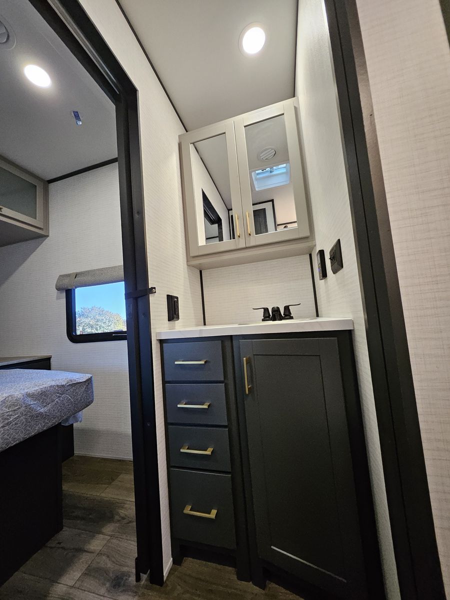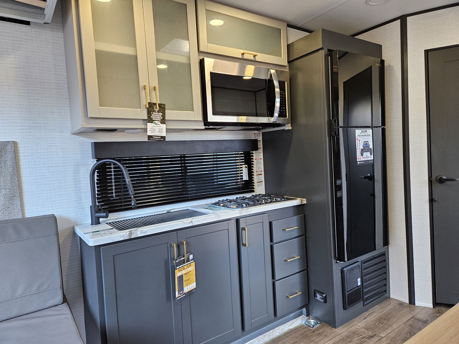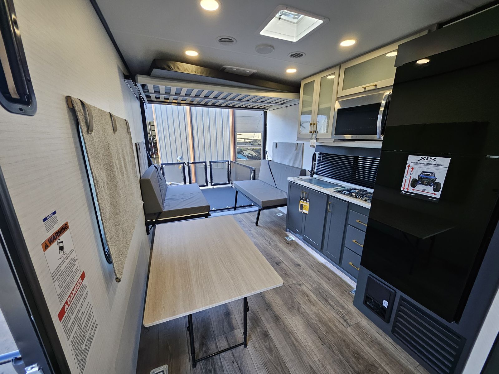 Kitchen with Full Size 12V Fridge, Microwave, 3 Burner Cooktop, and Large Sink!