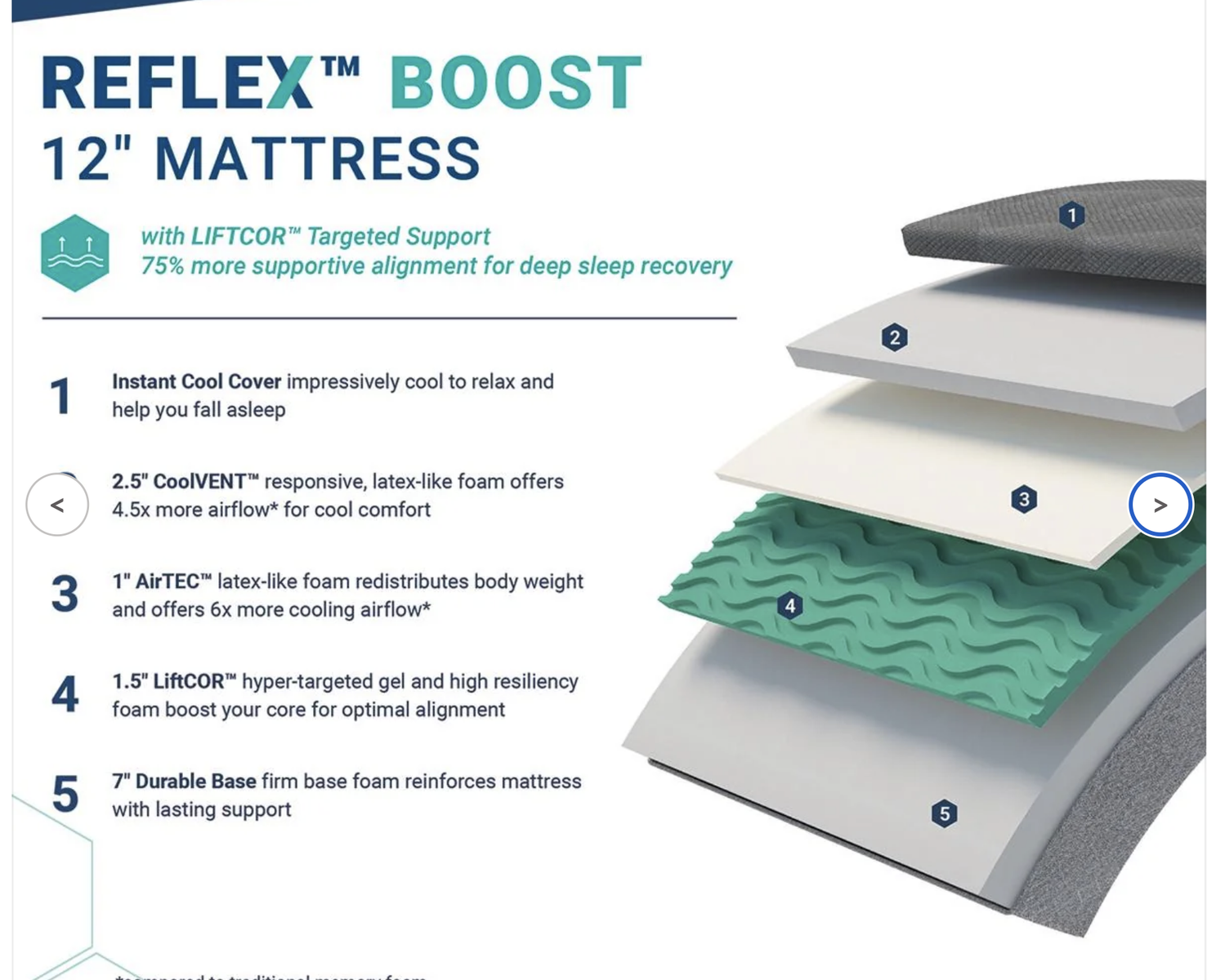Designed for 75% more supportive alignment, our proprietary LiftCOR™ layer features highly resilient gel bands that lift exactly where you need it – your core. Precision-contoured foam enhances alignment with responsive, zoned support for different parts of the body.
