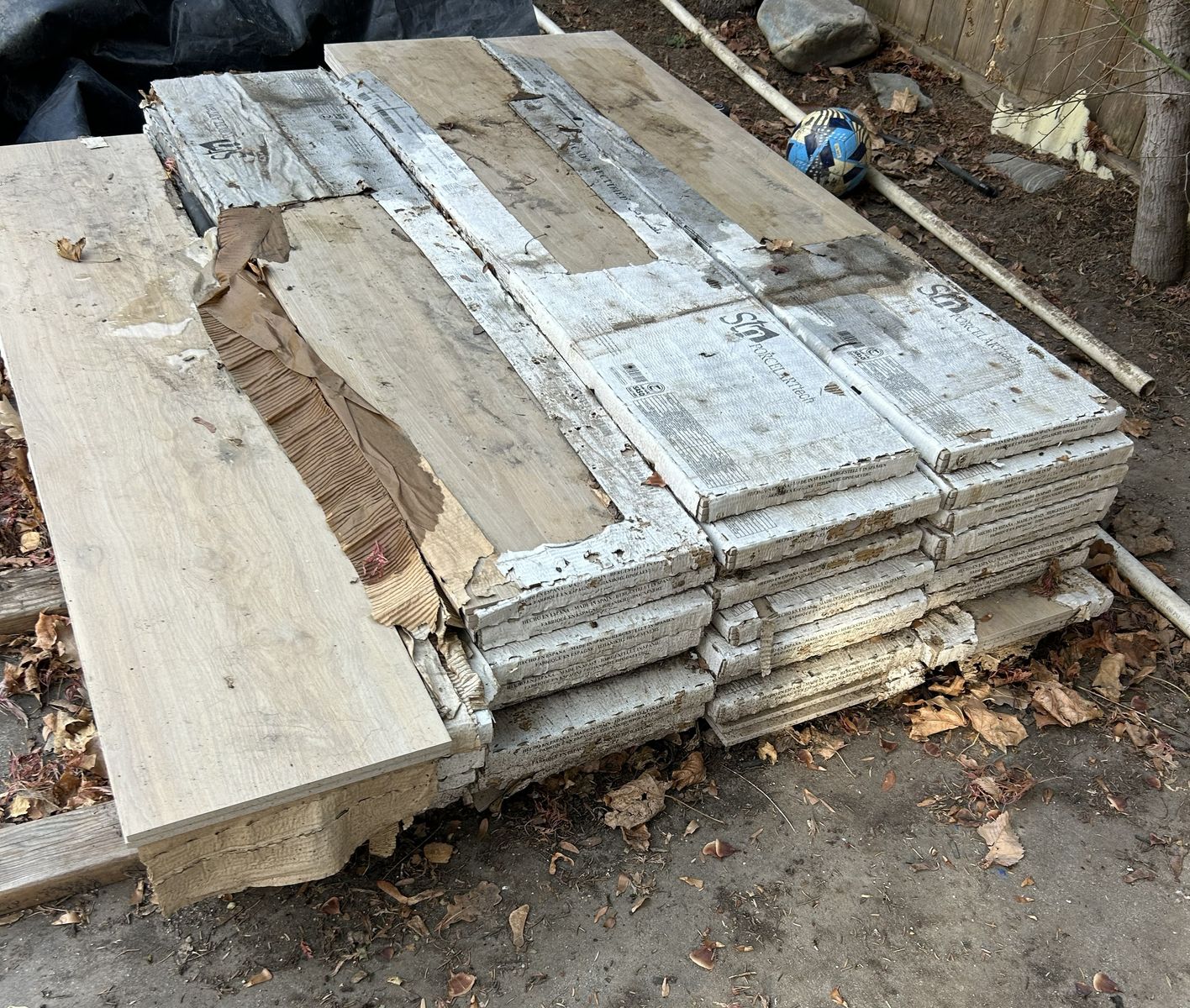 Tile is new, but stack is outside. No harm has been done to the tile, but the cardboard is old looking. $50 for entire stack of tile. Buyer must haul away.