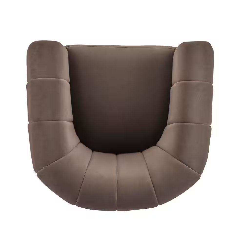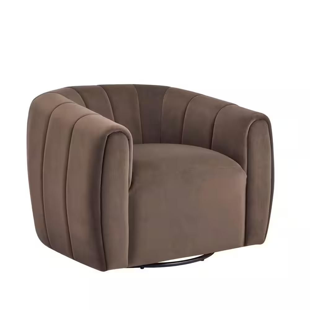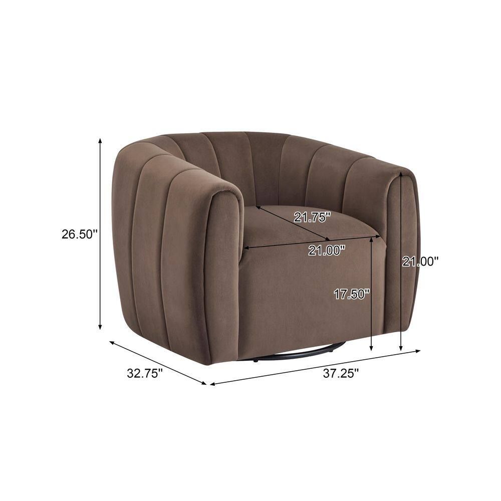 Add a touch of modern elegance to your space with the Oslo upholstered velvet swivel club chair. The luxurious dark brown-colored velvet upholstery offers both comfort and style, while the sleek iron frame provides a contemporary contrast and durability. This chair's swivel design allows for easy movement, making it perfect for living rooms, offices, or reading corners. Its chic, minimalist look adds sophistication to any room, making it an ideal choice for those seeking both functionality and a stylish statement piece.. Arm Style: Slope Arm. Assembly Required: Assembly Required. Care Instructions: Wipe clean with a dry cloth, when needed. Chair Type: Arm Chair. Color Family: Brown. Color/Finish: Dark Brown. Features: Solid Wood,Swivel. Frame Material: Wood. Hub Required: No hub connection available. Interior Furniture Type: Accent Chair. Pattern: Solid. Product Weight (lb.): 54.45 lb. Returnable: 30-Day. Shape: Square. Upholstery Material: Velvet. Weight Capacity (lb.): 300 lb. Product Depth (in.): 32.75 in. Product Height (in.): 26.5 in. Product Width (in.): 37.25 in. Seat Depth (in.): 21.75 in. Seat Height (in.): 17.5 in. Seat Width (in.): 21 in. Chair Type: Arm Chair. Upholstery Material: Velvet. Arm Style: Slope Arm. Seat Height (in.): 17.5 in. Features: Swivel. Frame Material: Wood. Features: Solid Wood. Pattern: Solid