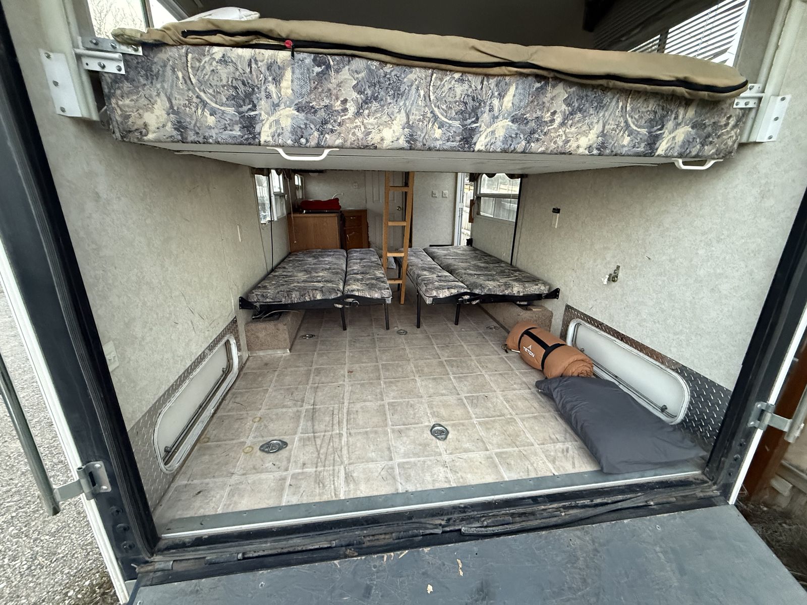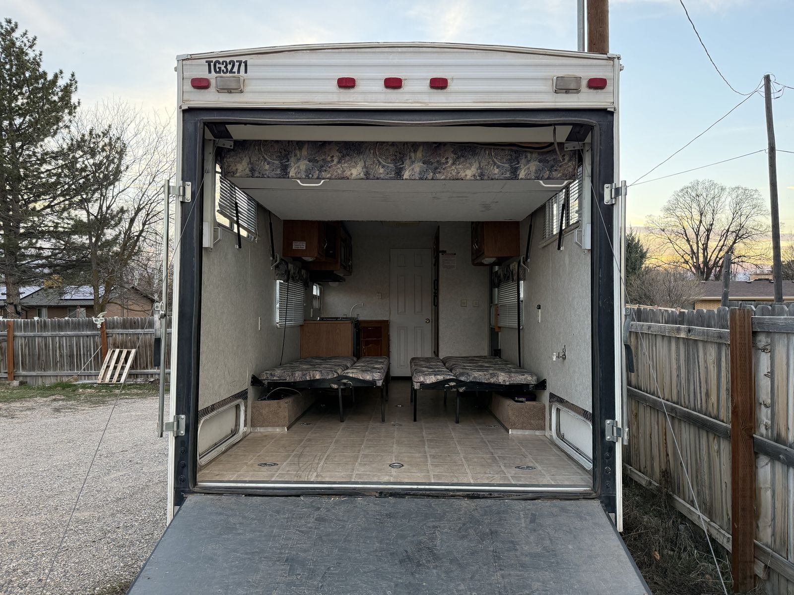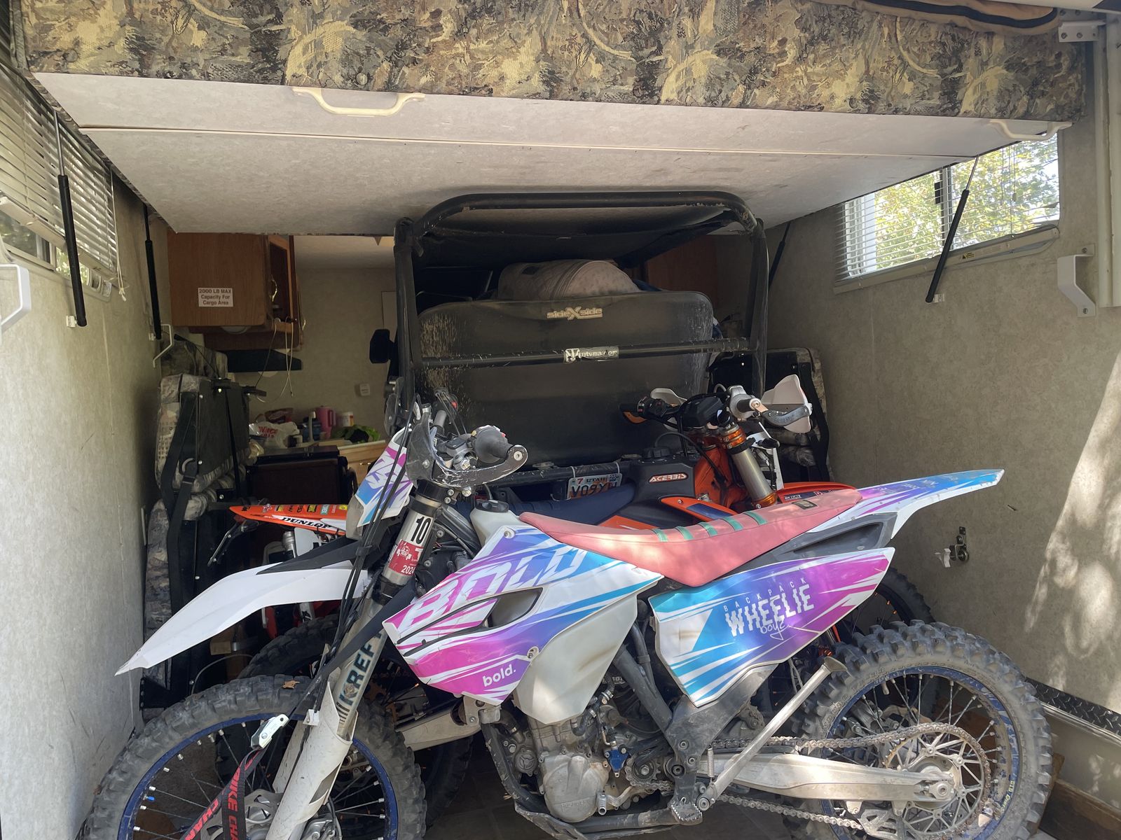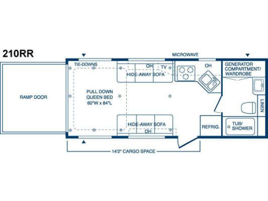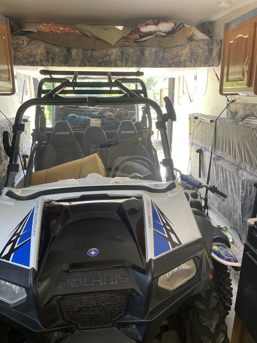 This has been a great trailer for our family for the last 6 years but it’s time to move on. This is a very functional, but small layout compared to many toy haulers and can be towed with a 1/2 ton truck. I have been able to haul our RZR (two seater with added rear bench seat and cage) plus two full size dirt bikes and a small kids dirt bike at the same time. Cargo space is 72” tall, length is 14’2”, width between flip up sofas is about 80”.
